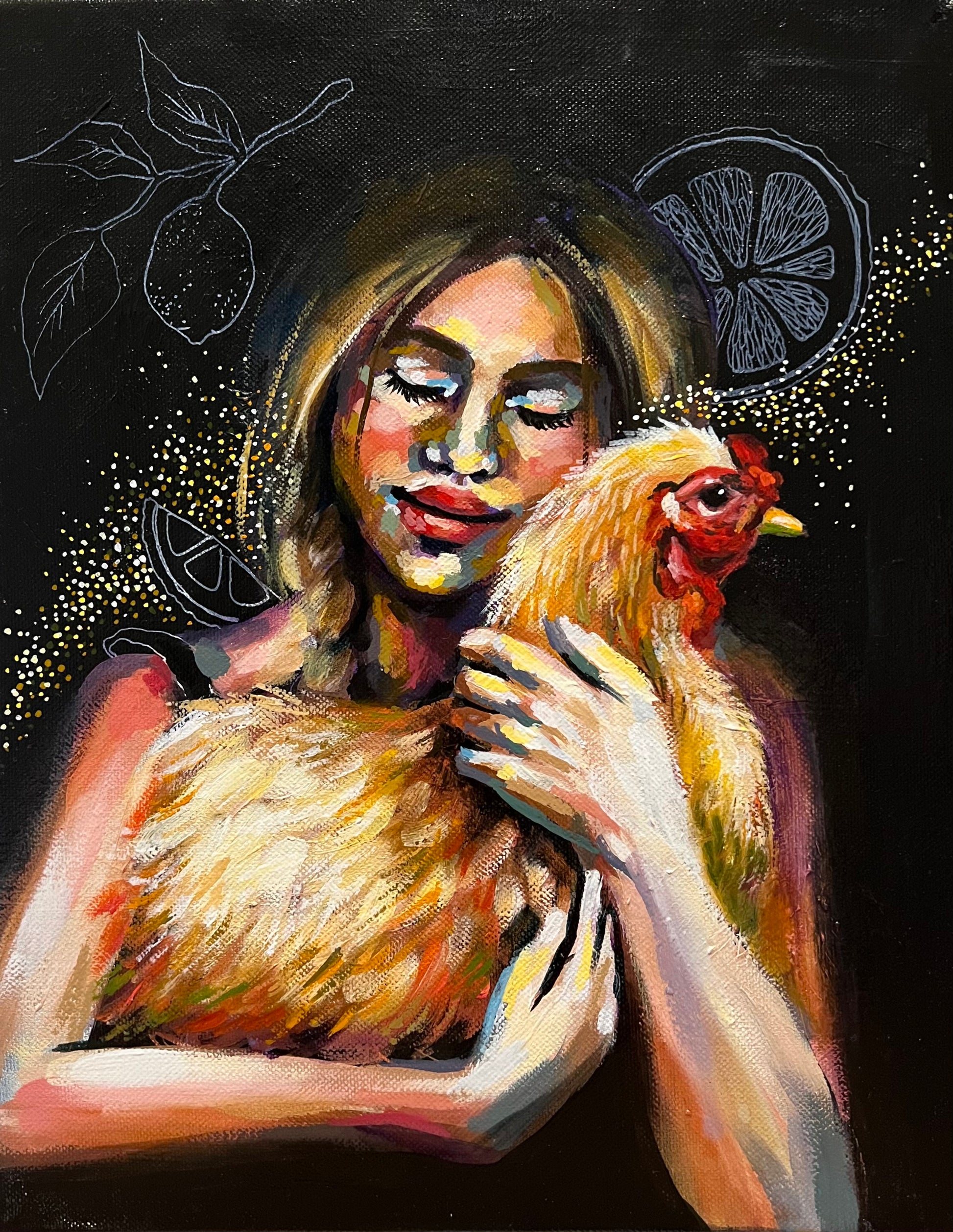 “All You Need” is part of the Less Meat series, celebrating the beauty of compassion and the deep connection between humans and animals. This mixed-media artwork features a serene figure holding a hen with tenderness and care, surrounded by vibrant elements such as lemons and radiant dots, symbolising vitality, kindness, and the interconnectedness of all living things.