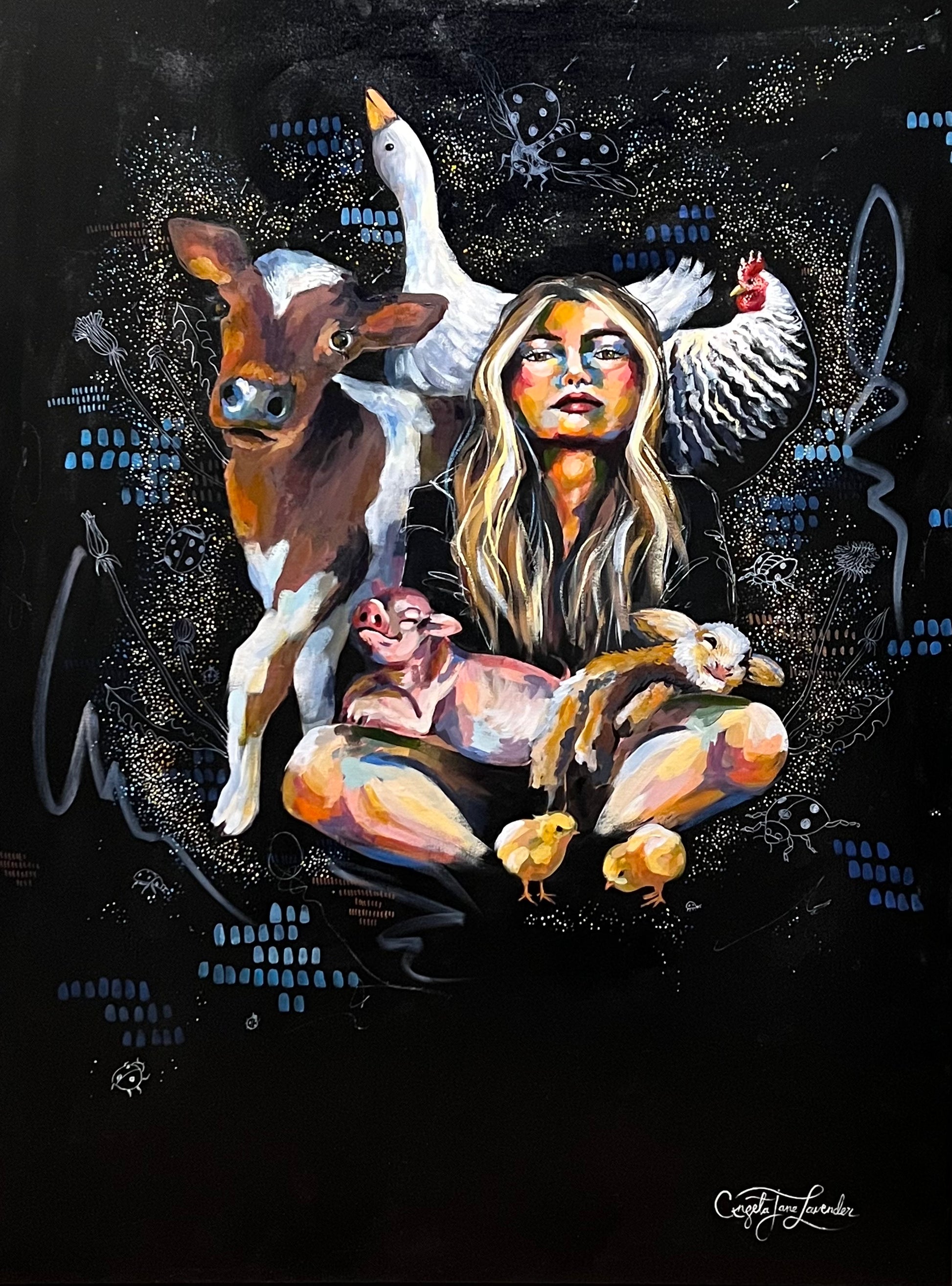 “Alliance” is a powerful statement piece that honours unity, compassion, and our shared connection to all living beings. This vibrant mixed-media artwork features a serene woman surrounded by farm animals—a cow, goose, chicken, lamb, piglet, and baby chicks—representing harmony and the nurturing spirit. Against a bold black backdrop, the intricate details and glowing colours bring life to this scene of interdependence and care.