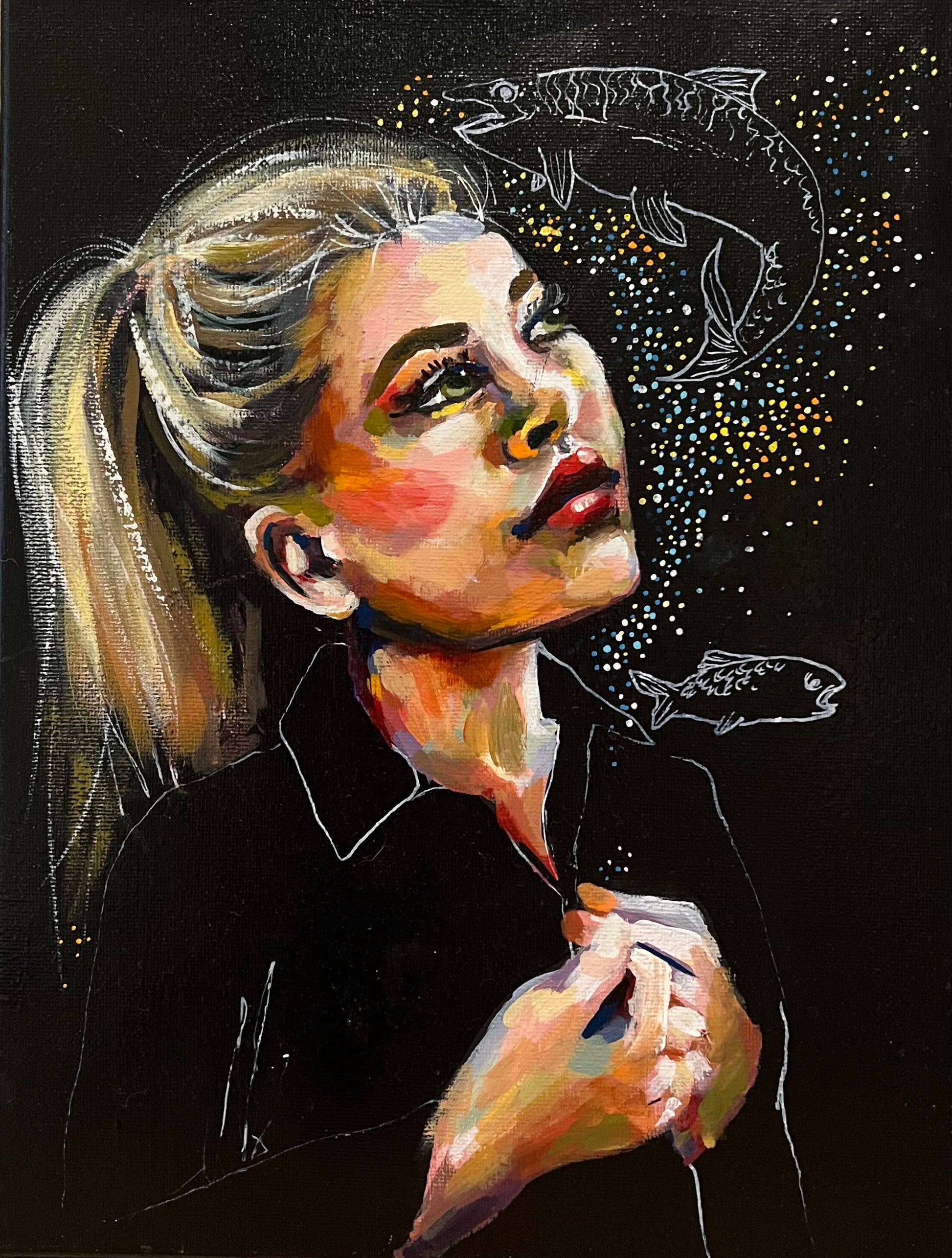 While the fish evoke a sense of beauty and hope, they also serve as a reminder of the challenges marine life faces, including overfishing, pollution, and habitat destruction. The scattered luminous dots connect the figure to the world around her, symbolising the interconnectedness of dreams, actions, and their consequences.