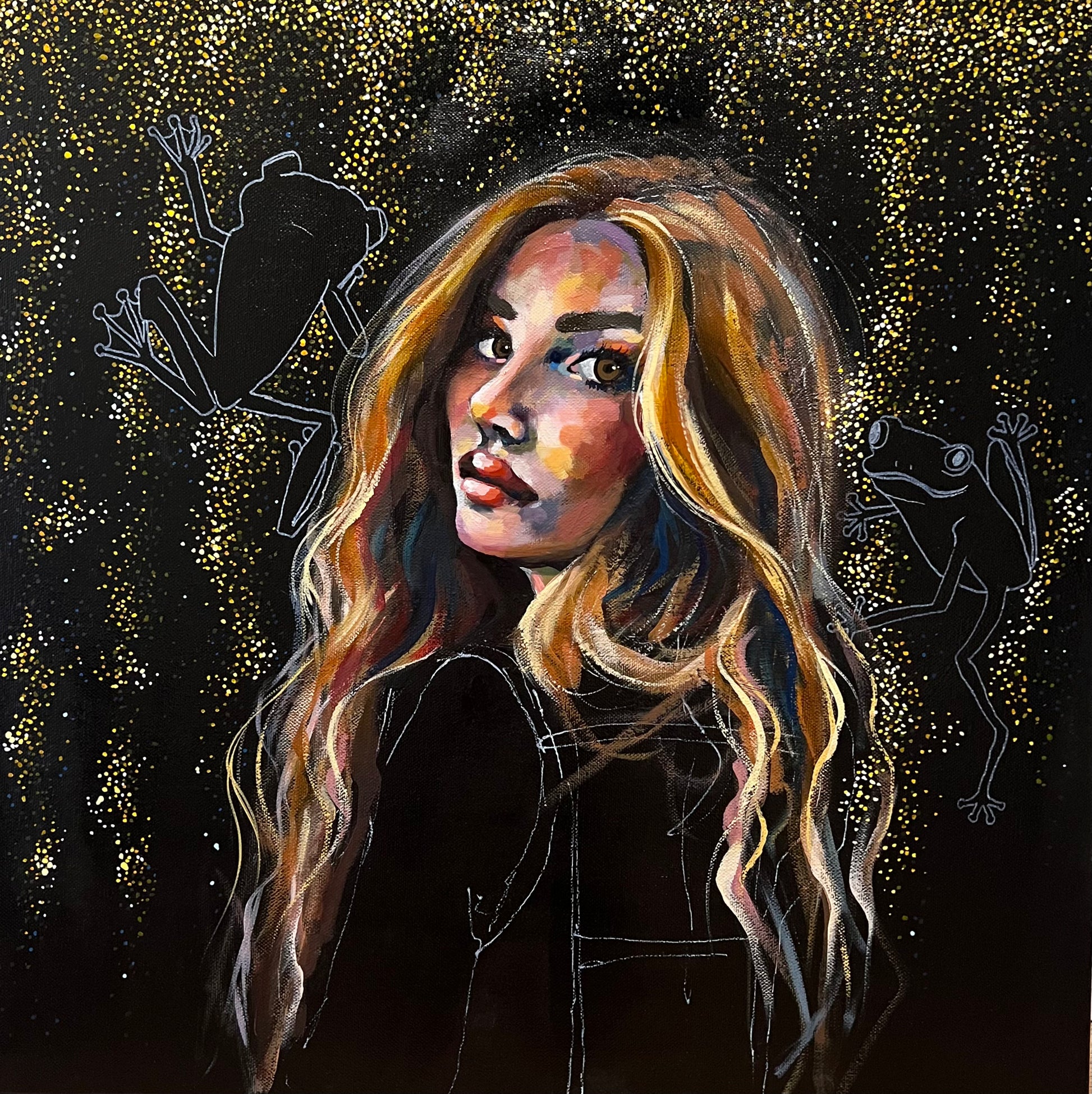 Conscience” serves as a visual dialogue between humanity and nature. With glowing golden accents and delicately rendered frogs, this painting symbolises the fragile balance of ecosystems and our role as caretakers. The central figure’s gaze reflects a sense of responsibility and introspection, reminding us to listen to the quiet voice of conscience urging us to make choices that honour and protect the natural world.