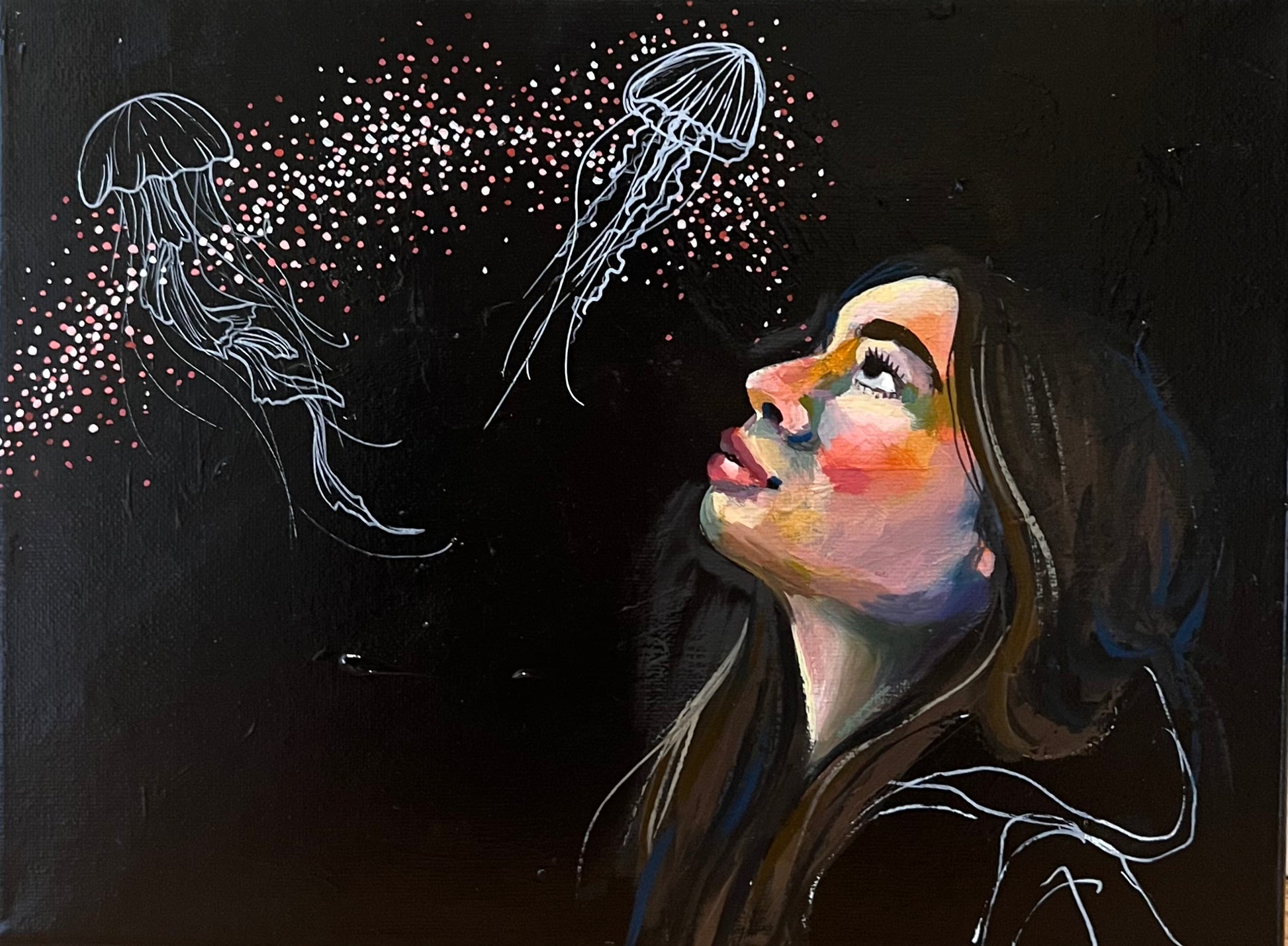 Curious” is a stunning mixed media painting from Angela Jane Lavender’s Less Meat series. This intimate artwork captures a woman gazing upward at two ethereal jellyfish, surrounded by delicate trails of dots and soft lines. The composition evokes a sense of wonder, highlighting the beauty of underwater life and humanity’s deep connection to nature.