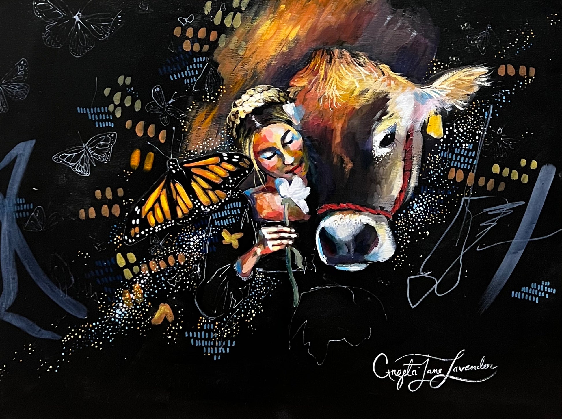 “Friend” is a heartfelt exploration of connection, gentleness, and harmony with nature. This stunning mixed-media artwork portrays the intimate bond between a woman and a cow, surrounded by fluttering monarch butterflies and delicate line-work. The vibrant colours and bold textures invite you to reflect on the beauty of companionship, love, and our connection to the natural world.