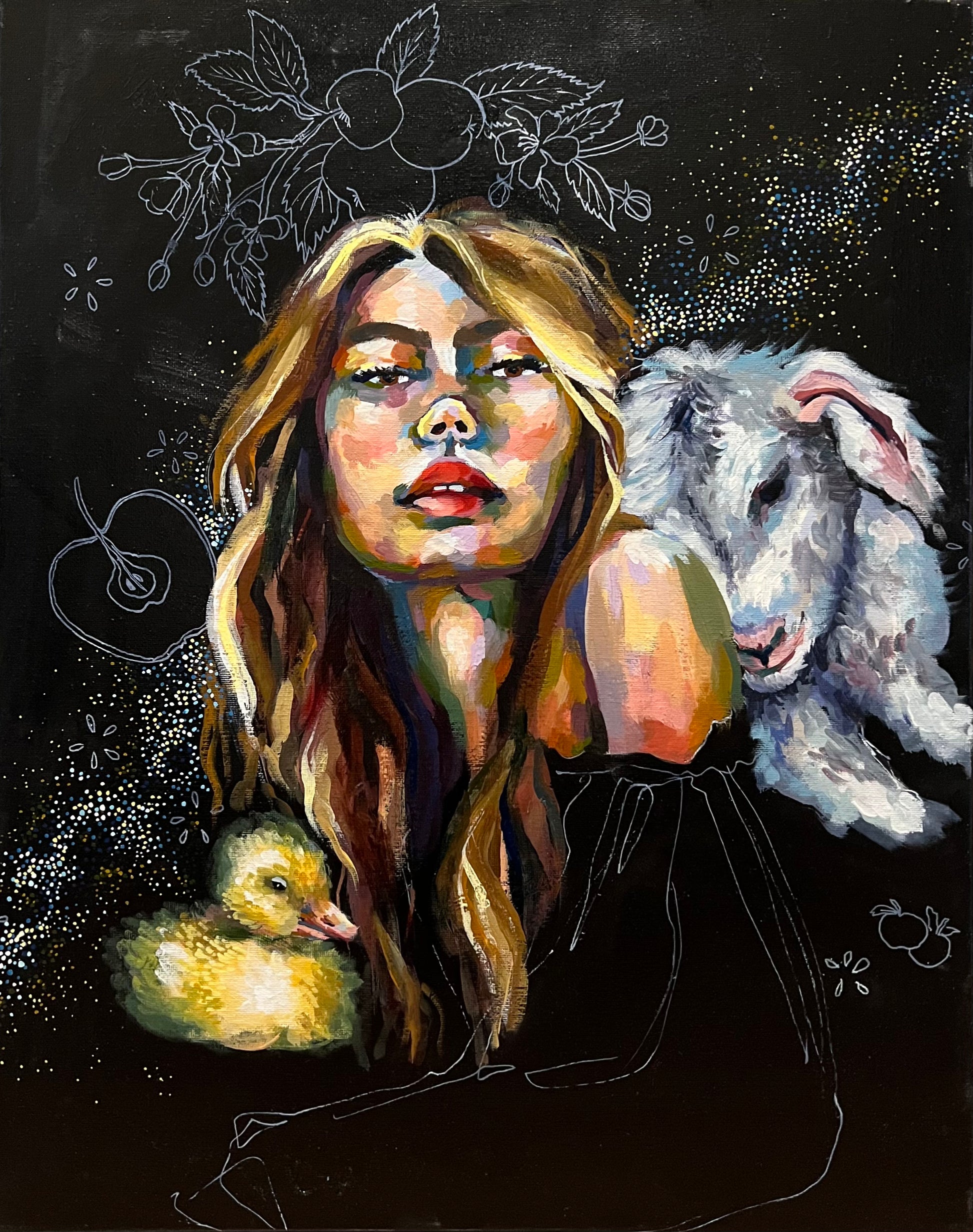 “Guardian” captures a tender moment of connection between humanity and nature. This striking mixed-media artwork radiates warmth and care, with a luminous female figure symbolizing protection and nurturing. Accompanied by a serene goat and a gentle duckling, this piece evokes themes of guardianship, innocence, and unity. The surrounding delicate botanical illustrations, including apples and blossoms, serve as a reminder of the harmony and abundance that comes from respecting and cherishing all life forms.