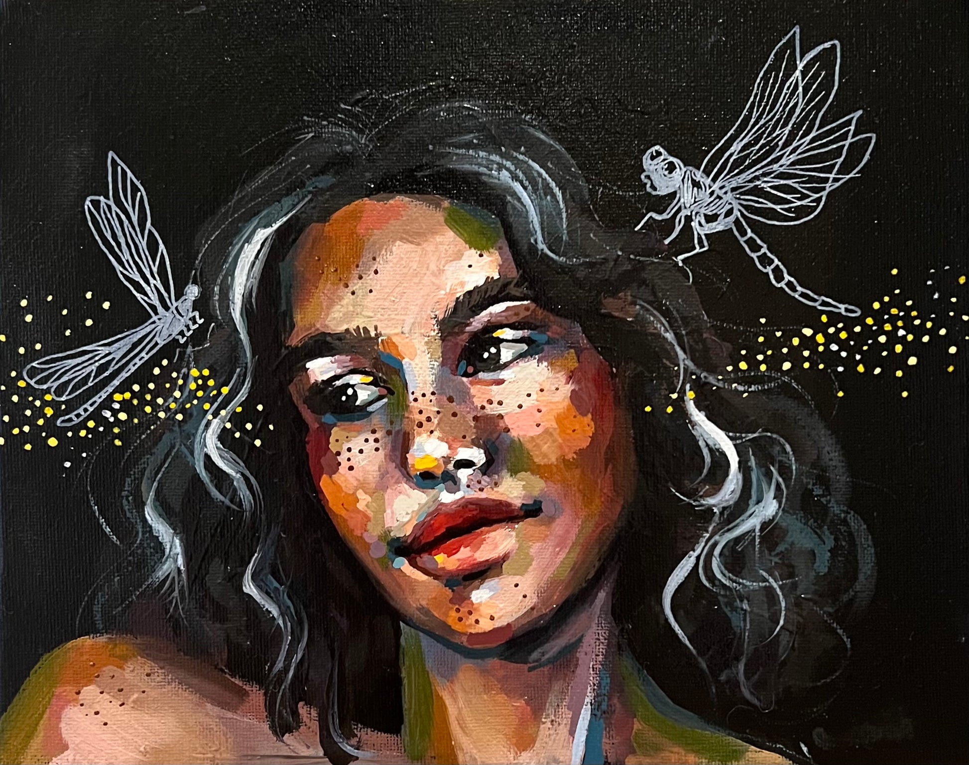 “In Tune” captures the quiet beauty of self-awareness and connection to the natural world. This mixed-media artwork features a serene woman surrounded by delicate dragonflies, their translucent wings and soft movements symbolising transformation, adaptability, and the lightness of being. The interplay of vibrant colours against the black backdrop creates a stunning contrast, inviting viewers to reflect on the harmony within themselves and their surroundings.