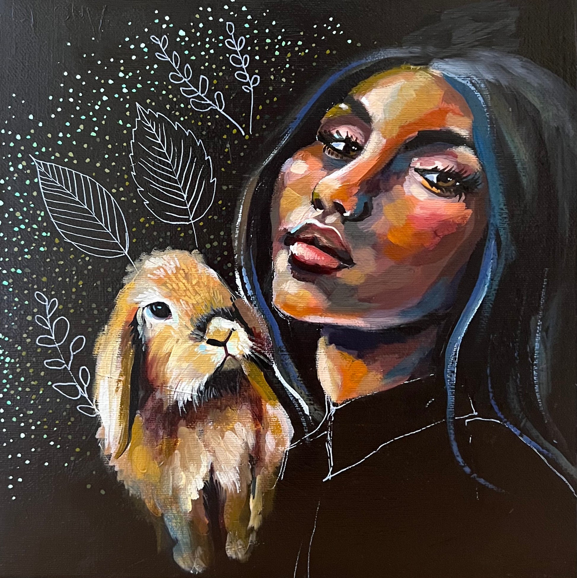 “Obvious” is a heartfelt piece from Angela Jane Lavender’s Less Meat series, featuring a serene connection between a woman and a rabbit. The painting symbolizes a future where compassion for all creatures is central, inspiring viewers to reflect on the harmonious relationship humans can have with animals and the environment.