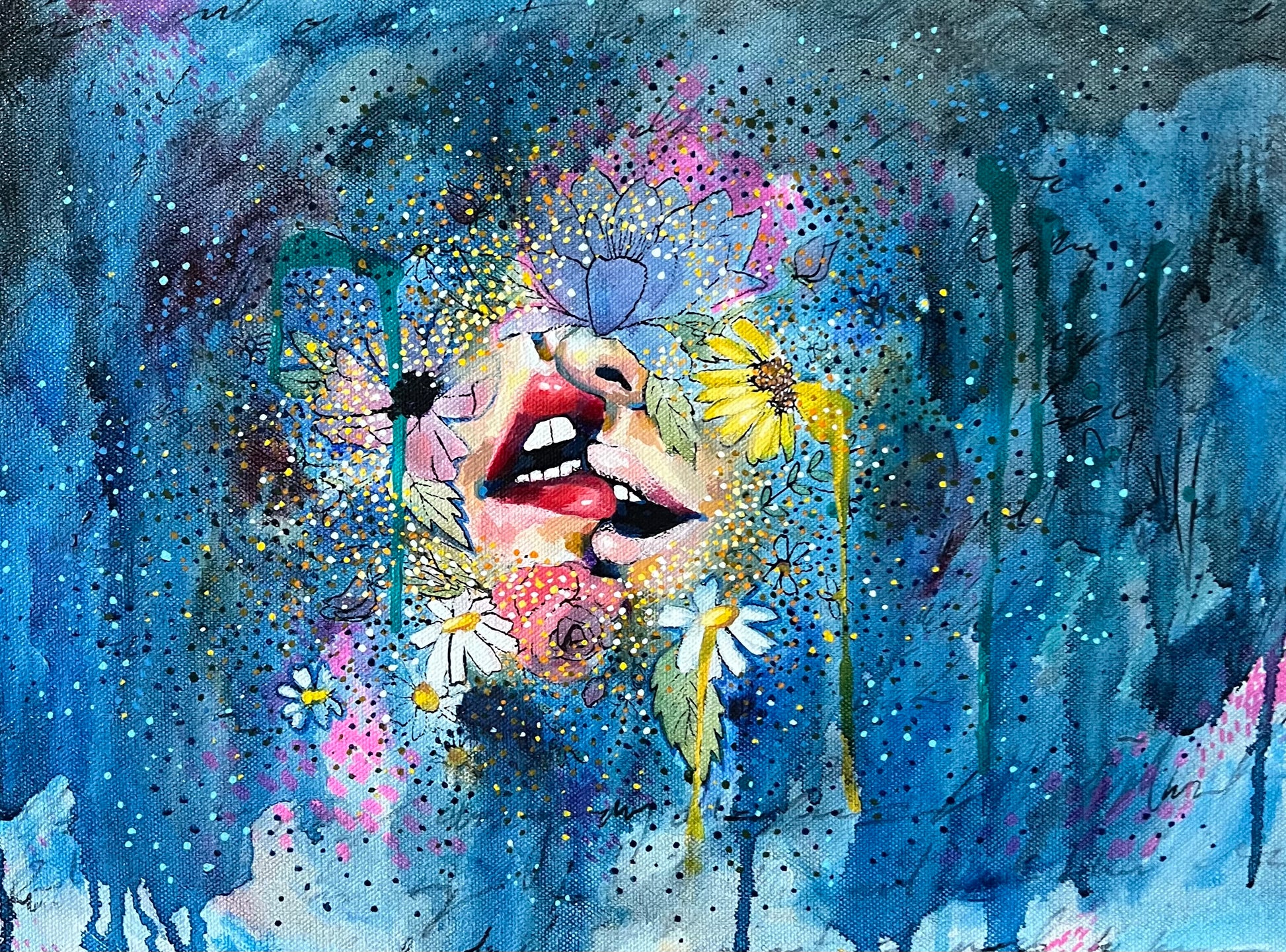 The juxtaposition of vibrant blooms and the parted lips evokes a sense of longing, beauty, and hope. Every brushstroke tells a story, creating a visual experience that feels deeply personal yet universally resonant.