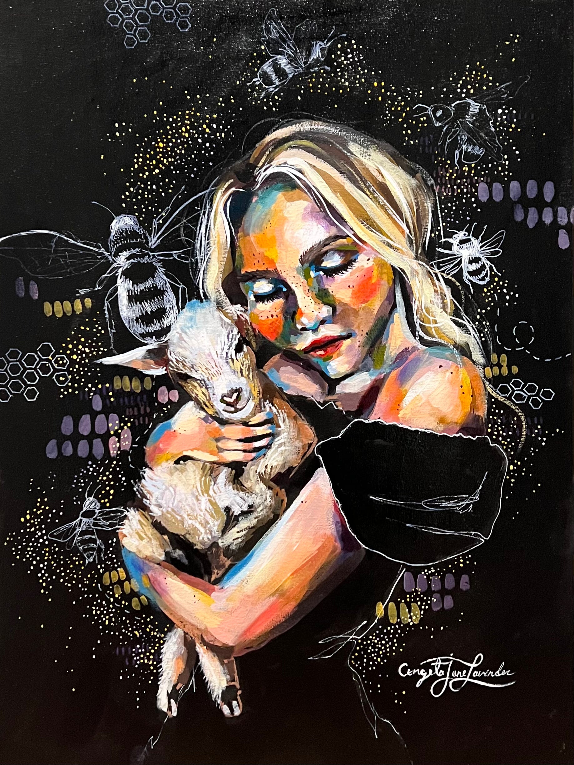 The Protector” is a deeply moving mixed media painting from Angela Jane Lavender’s Less Meat series. This piece captures a tender moment between a woman and a baby goat, surrounded by delicate bees and honeycomb motifs. Set against a rich black background, the vibrant layers of colour and intricate details highlight themes of care, harmony, and our responsibility to nurture the natural world.