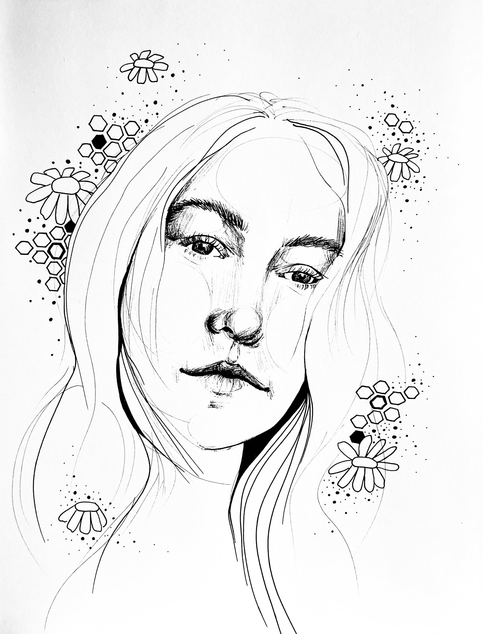 ‘Reflection’ is a deeply personal self-portrait created in 2023, inviting you to explore themes of introspection, vulnerability, and self-love. With its intricate linework and delicate details, this original ink drawing captures the beauty of embracing yourself fully and finding light within.
