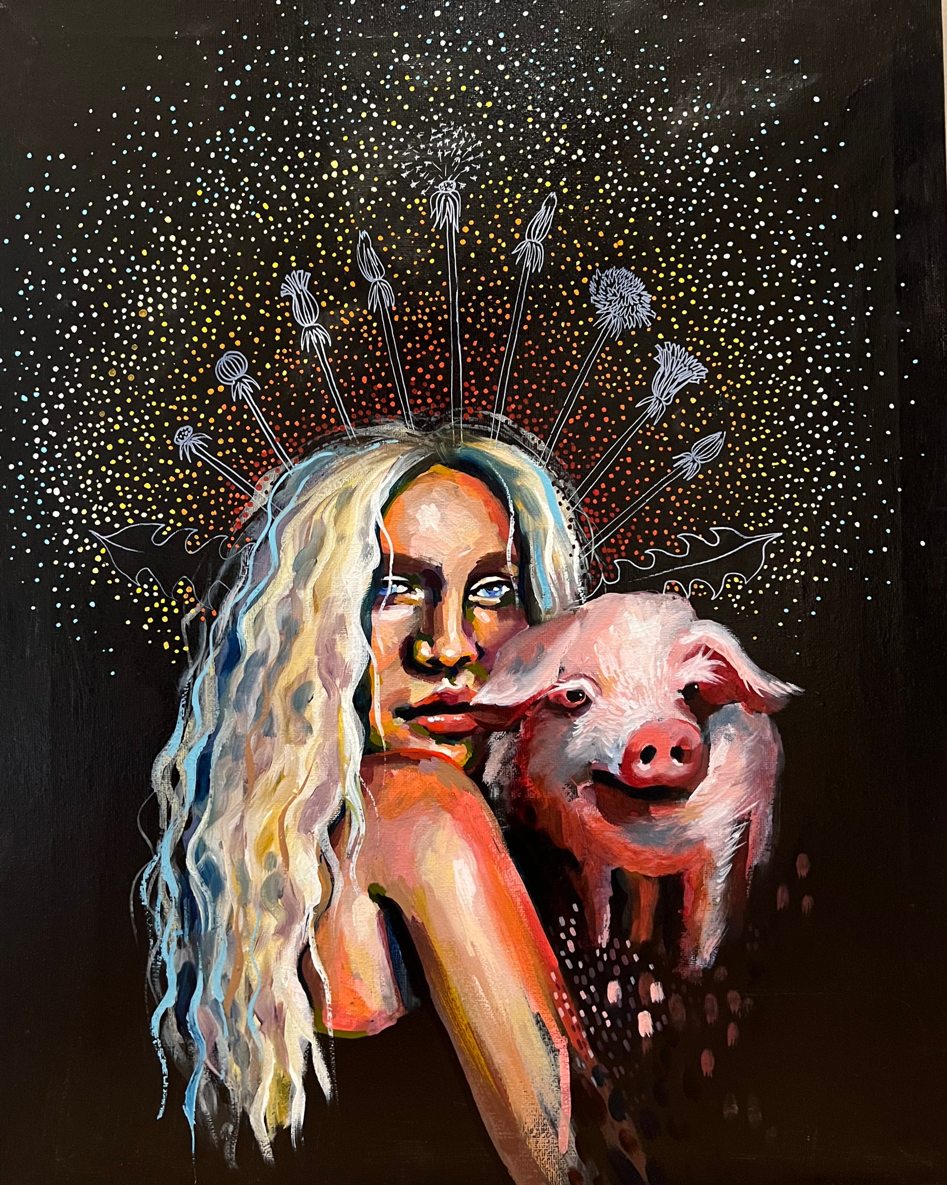 This evocative mixed-media piece reflects the interconnectedness of all living beings. With intricate dot work and vibrant hues, the painting invites viewers to explore themes of compassion, resilience, and the sacred relationship between humanity and animals. The serene gaze of the figure paired with the trusting presence of the pig creates a narrative of harmony and understanding. It serves as a reminder to lead with love, protect our planet, and embrace our roles as stewards of a better future.