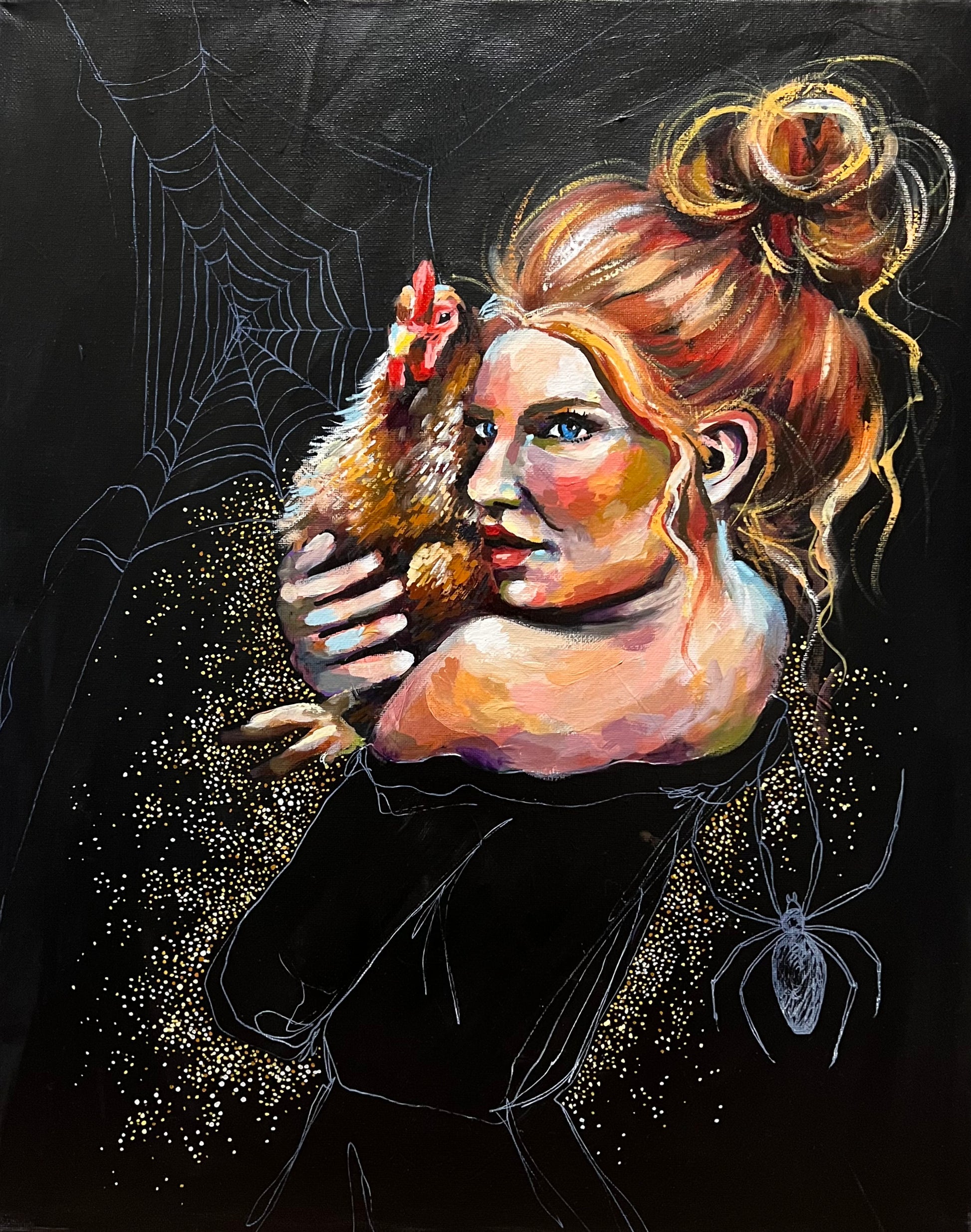 “Tender” is an intimate celebration of the love and care we can show to all living beings. This striking artwork portrays a woman embracing a chicken with tender loving care, reminding us that these animals are more than commodities—they are sentient beings worthy of compassion. The spider’s web in the background speaks to the delicate balance of life, while the glowing details evoke a sense of reverence and connection.