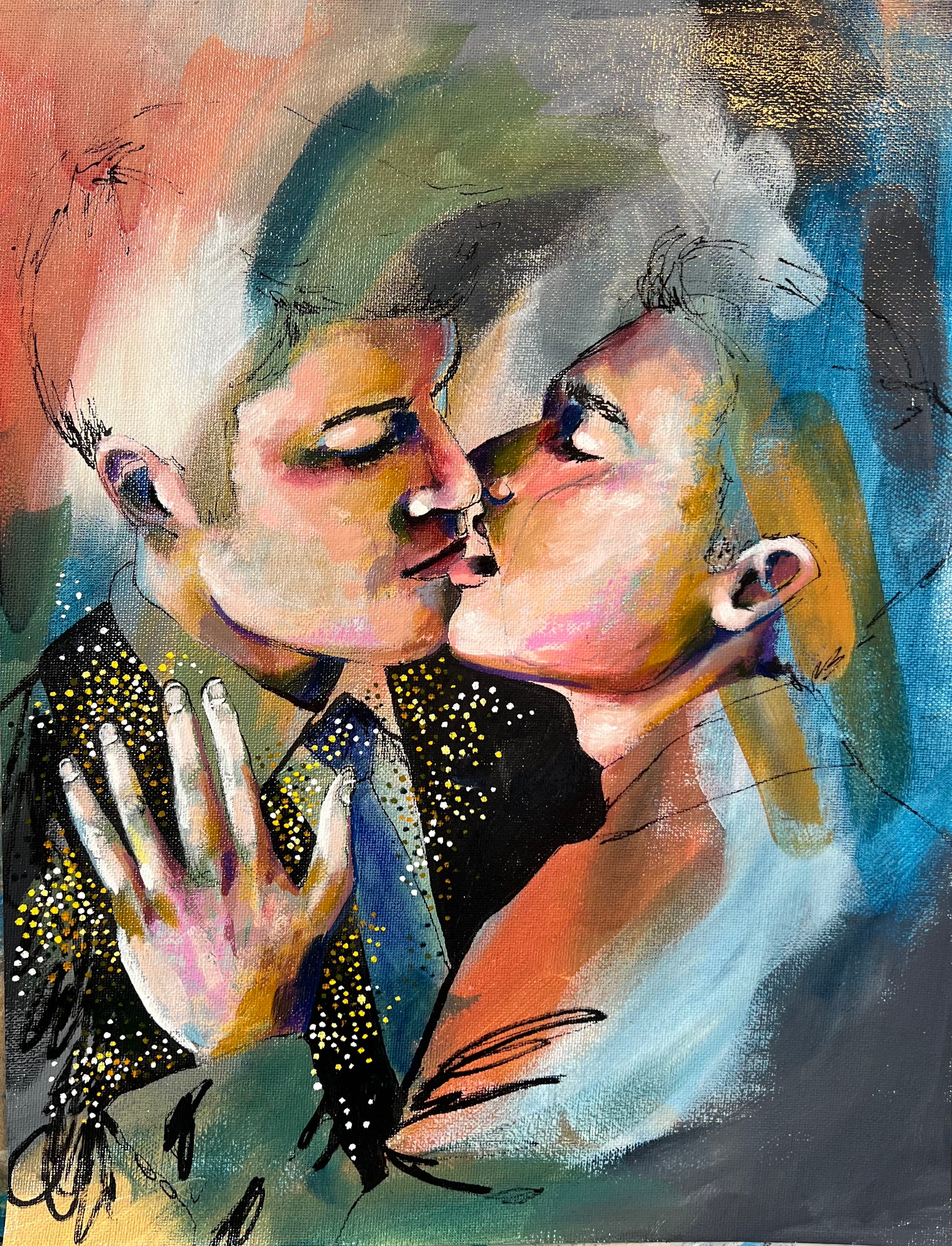 Well Suited” is a celebration of love, intimacy, and connection within the LGBTQ+ community. This vibrant mixed-media painting captures a tender moment between two figures, radiating warmth, passion, and authenticity. The interplay of expressive brushstrokes, dynamic colours, and intricate golden dots highlights the richness and depth of love, regardless of who we are or whom we love.