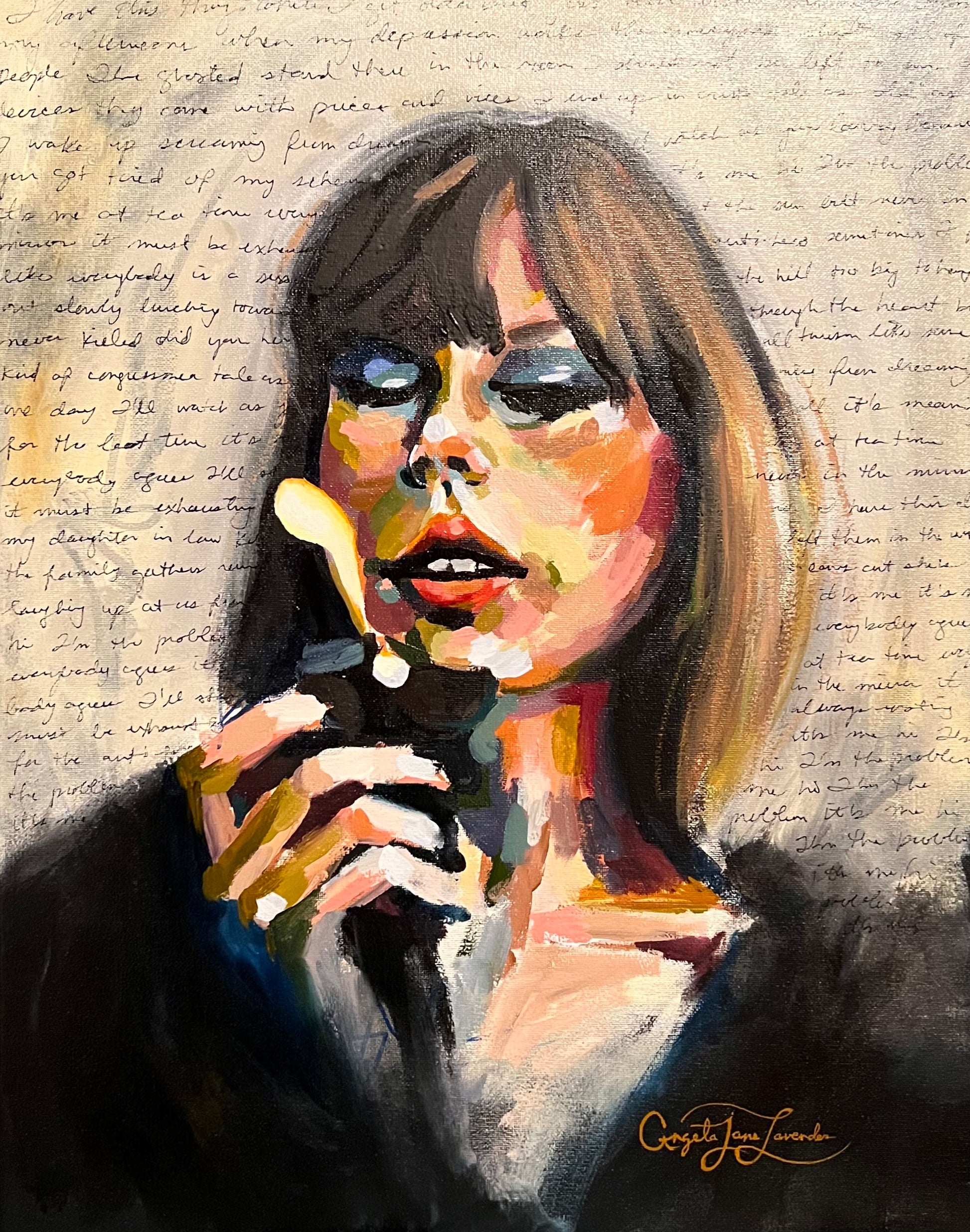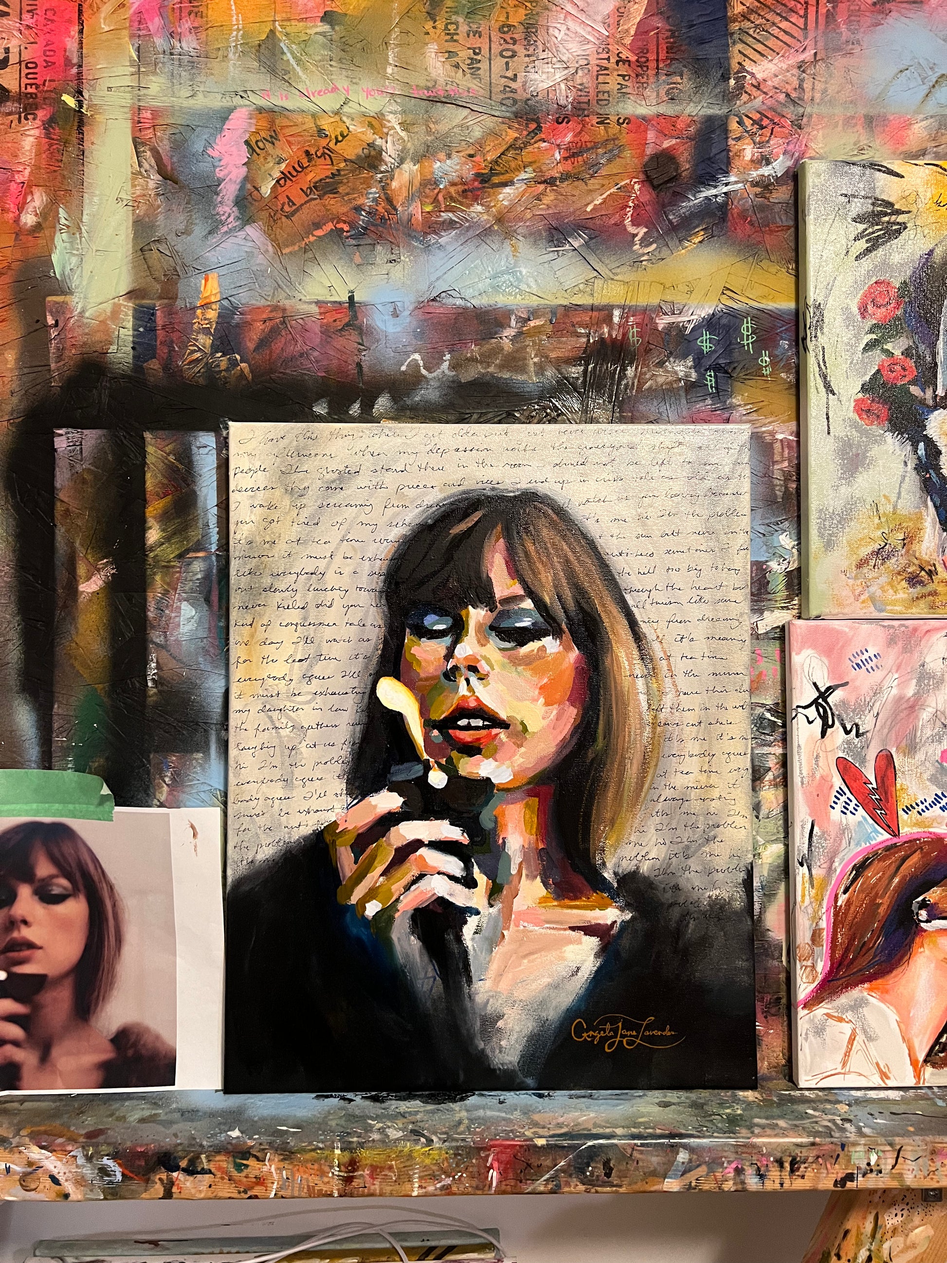 This portrait of Taylor Swift reimagines her iconic Midnights album cover with a layered and expressive mixed media approach. Created with acrylic and oil paints, the composition features the haunting and vulnerable lyrics of her song “Anti-Hero,” scrawled in the background with an oil paint pen.