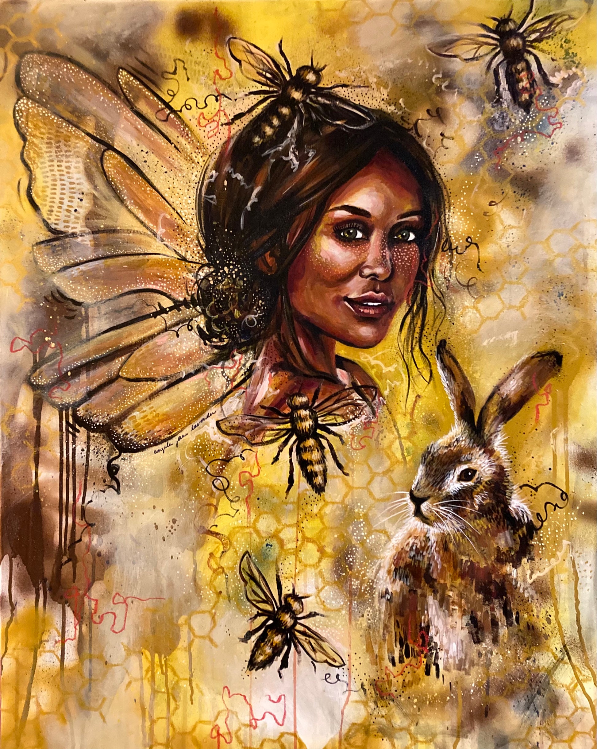 Assiduous Soul” is a celebration of resilience, community, and the interconnectedness of all living beings. The delicate bees symbolize hard work, unity, and the beauty of collaboration, while the rabbit stands as a reminder of gentleness and adaptability in the face of life’s challenges. This mixed media artwork weaves intricate textures, golden hues, and vibrant details to create a piece that feels alive with energy and purpose.