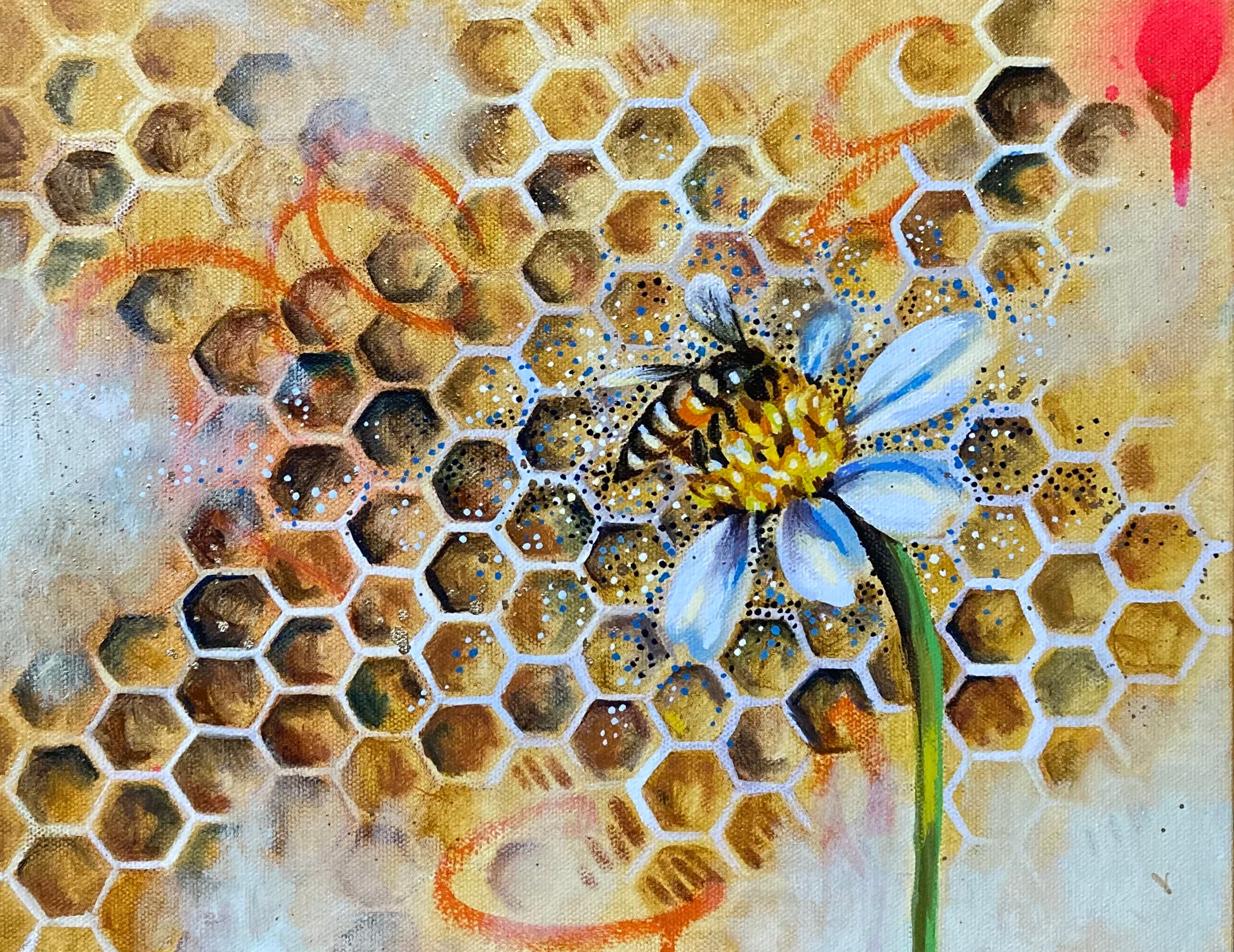 Body Language is a celebration of the interconnectedness of nature and the delicate harmony of life. This captivating painting features a honeybee delicately poised on a flower, surrounded by intricate honeycomb patterns. The golden tones and textured details symbolize the vital role bees play in sustaining our world, serving as a gentle reminder of their resilience and importance.
