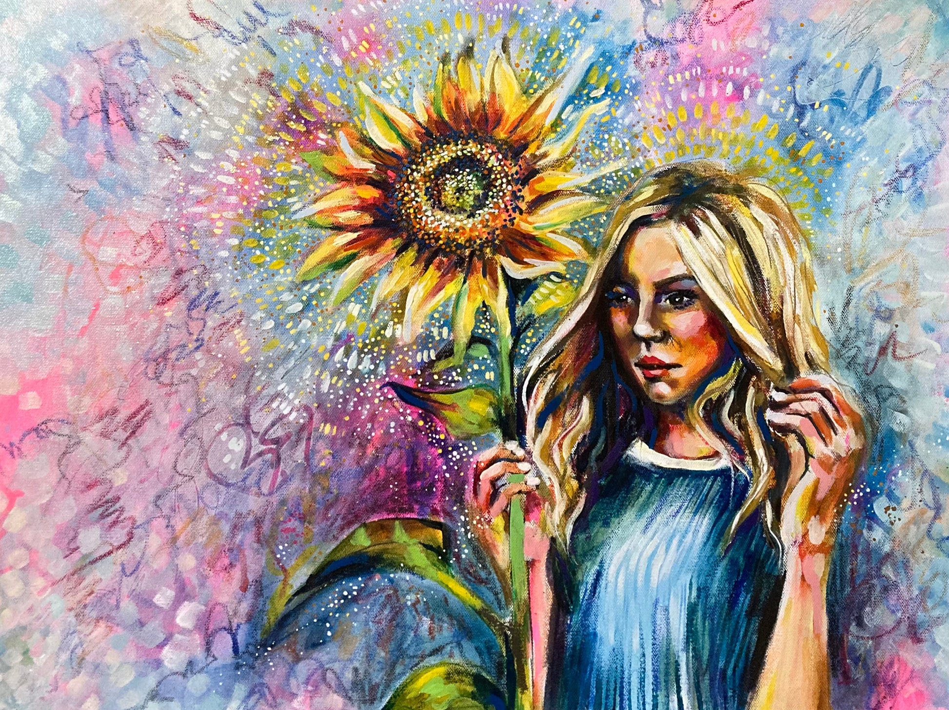 “Enough” is a vibrant mixed media painting that captures the quiet strength and radiant beauty of self-acceptance. Centred around a striking sunflower—a symbol of resilience, growth, and hope—this artwork invites you to reflect on your own journey toward embracing your worth. The figure stands grounded yet luminous, surrounded by layers of colours and textures that evoke both vulnerability and empowerment.