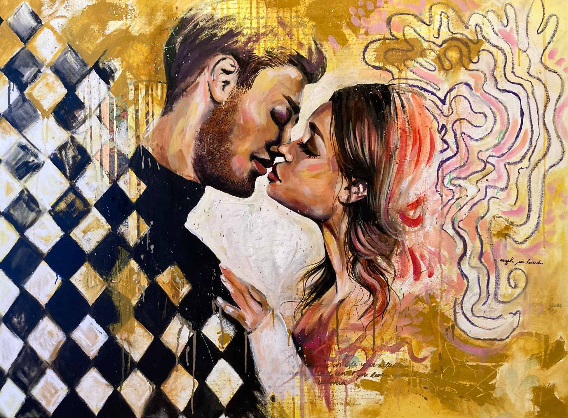 “Go Slow” captures the intensity of a moment suspended in time—a delicate dance between two souls engaged in an unspoken chess match of emotions. The harlequin pattern symbolizes strategy, vulnerability, and the careful moves we make in love. Rich layers of texture and colour intertwine with flowing movement, reflecting the inner dialogue of desire, trust, and hesitation. This artwork invites you to embrace the beauty of presence and connection, reminding us that love, like chess, is both an art and a game of patience. ♥️♥️♥️♥️