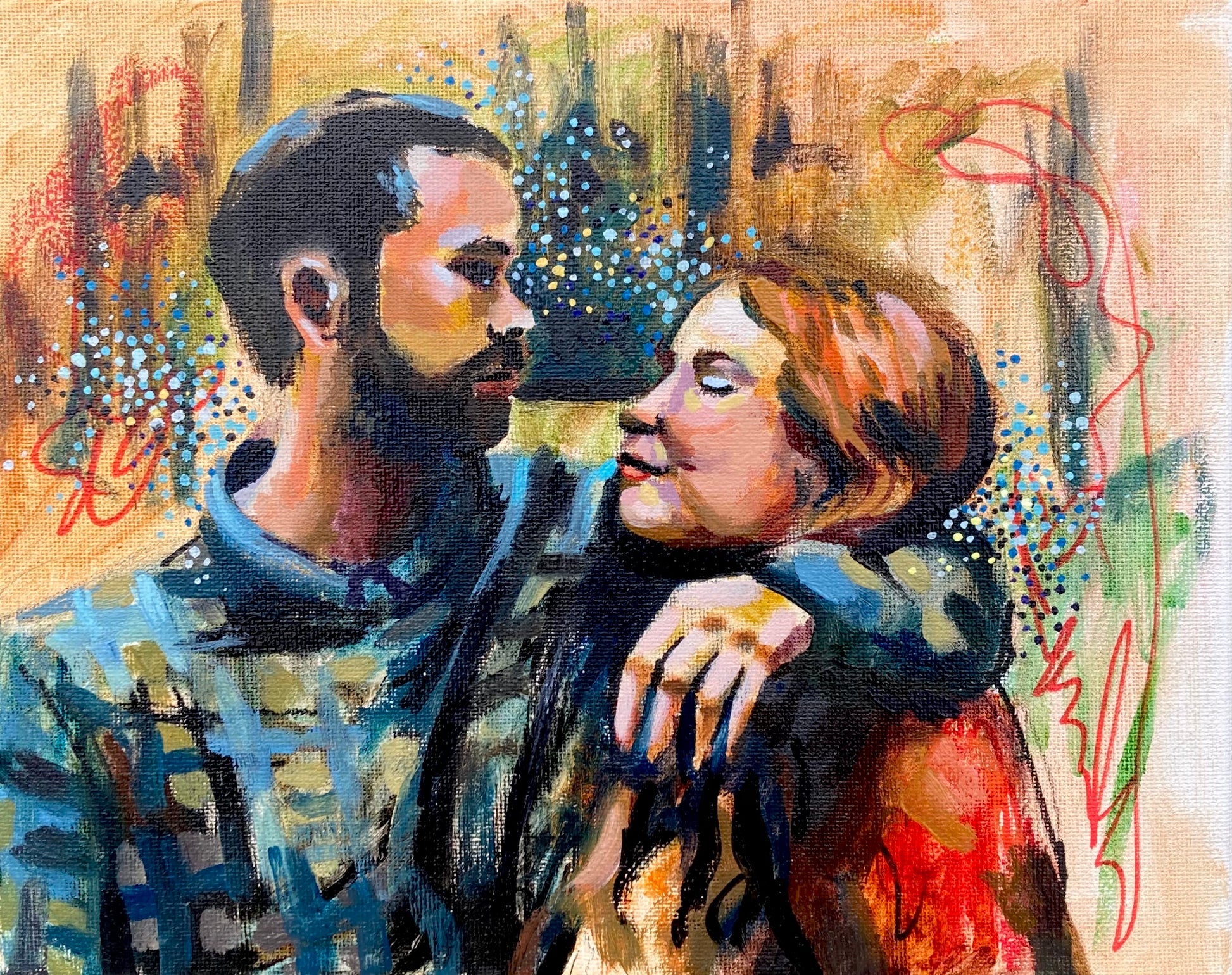 Through bold brushstrokes, intricate textures, and vibrant layers of color, the painting captures a moment of quiet connection between two figures. Their expressions and posture tell a story of intimacy, nostalgia, and the fleeting nature of time, mirroring the raw emotional journey of the iconic song.