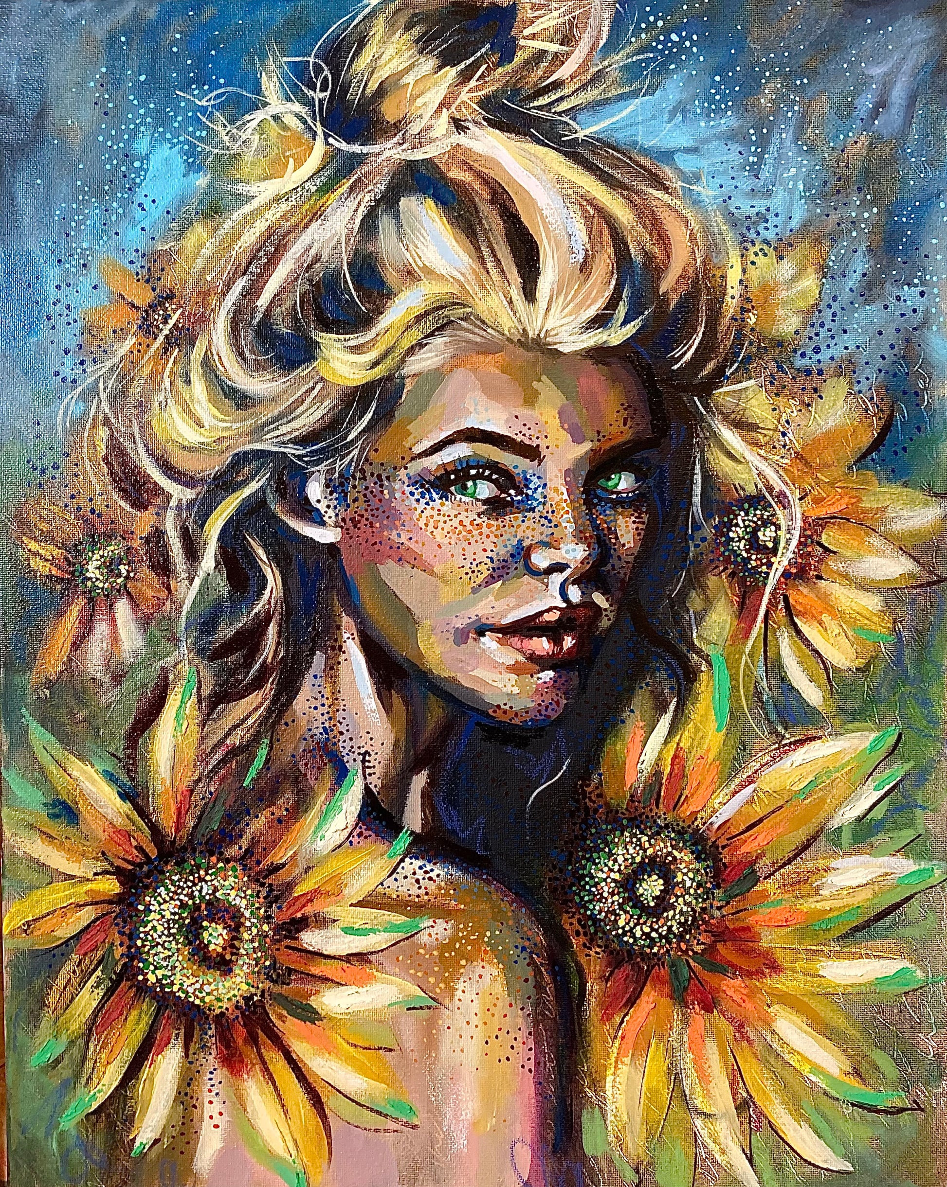 Discover the depth and vibrancy of Imprint, a captivating oil painting that radiates strength, beauty, and resilience. This piece showcases a bold figure adorned with sunflowers, symbolizing growth, light, and the lasting impact we leave on the world. Every brushstroke brings to life the intricate textures and dynamic colour palette, inviting you to explore the layers of emotion and meaning embedded within the artwork.