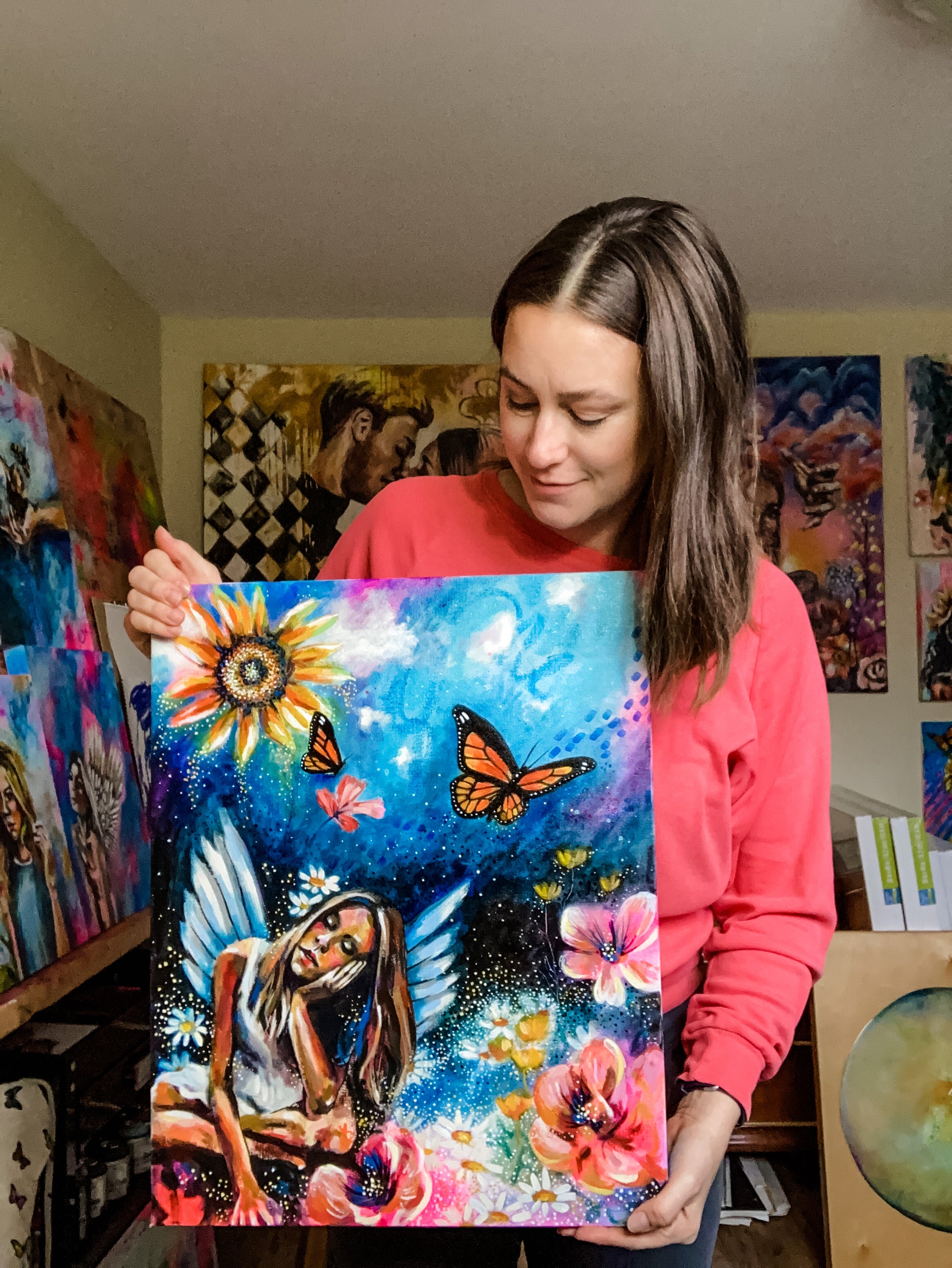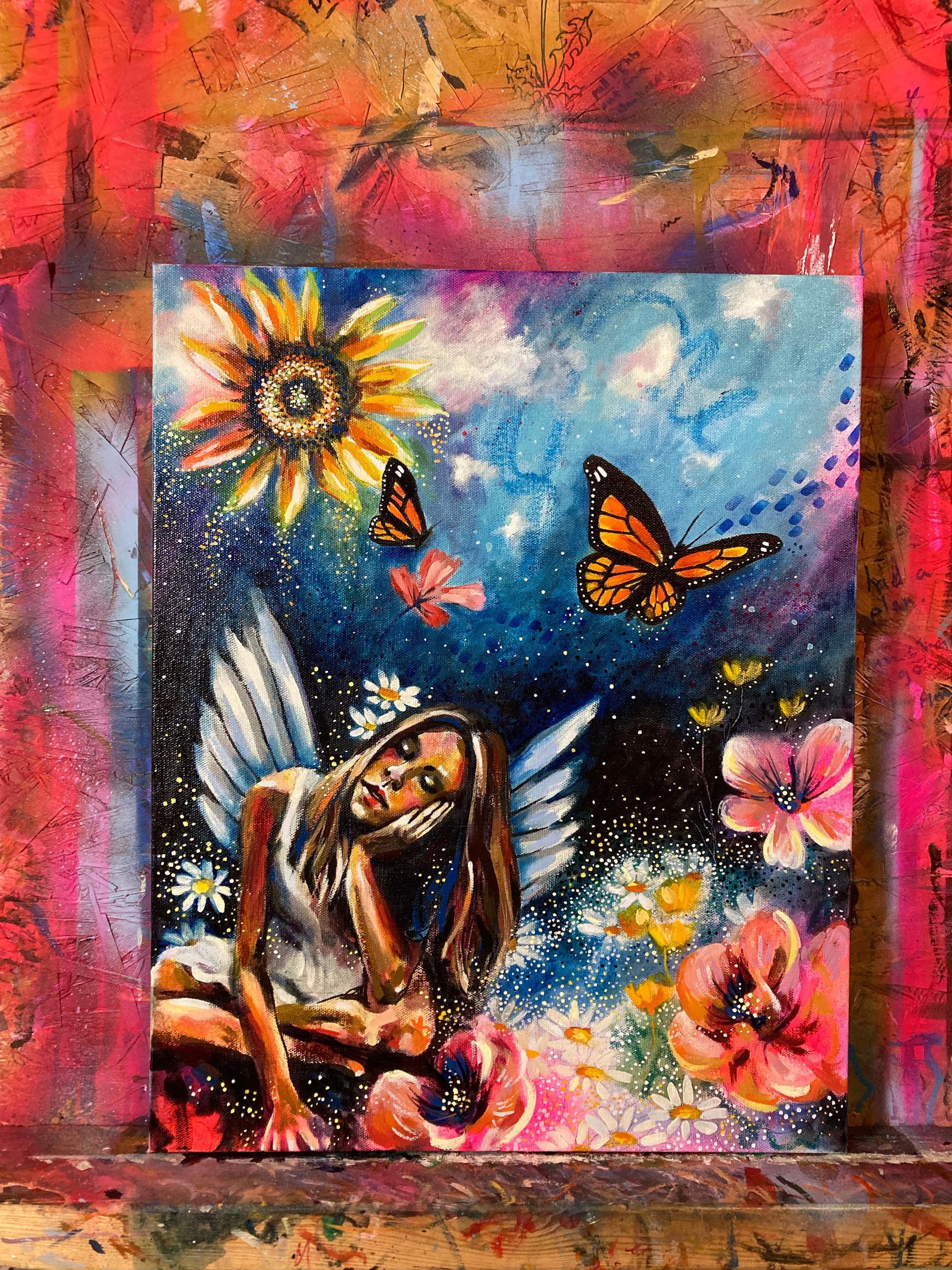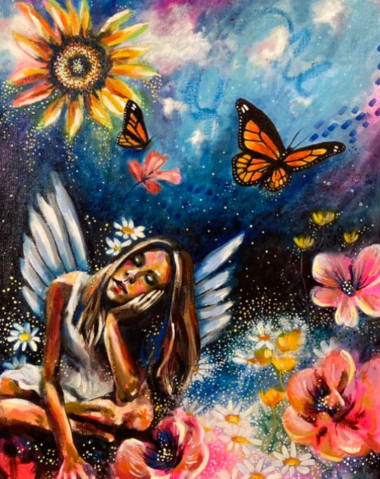In Between captures the quiet magic of transition, where one finds peace between dreaming and reality. This ethereal painting features a serene figure with angelic wings, surrounded by vibrant flowers, fluttering butterflies, and a glowing sunflower—a symbol of hope, growth, and connection to the natural world. The luminous colours and intricate details celebrate the beauty of transformation and the strength that comes from embracing life’s in-between moments.