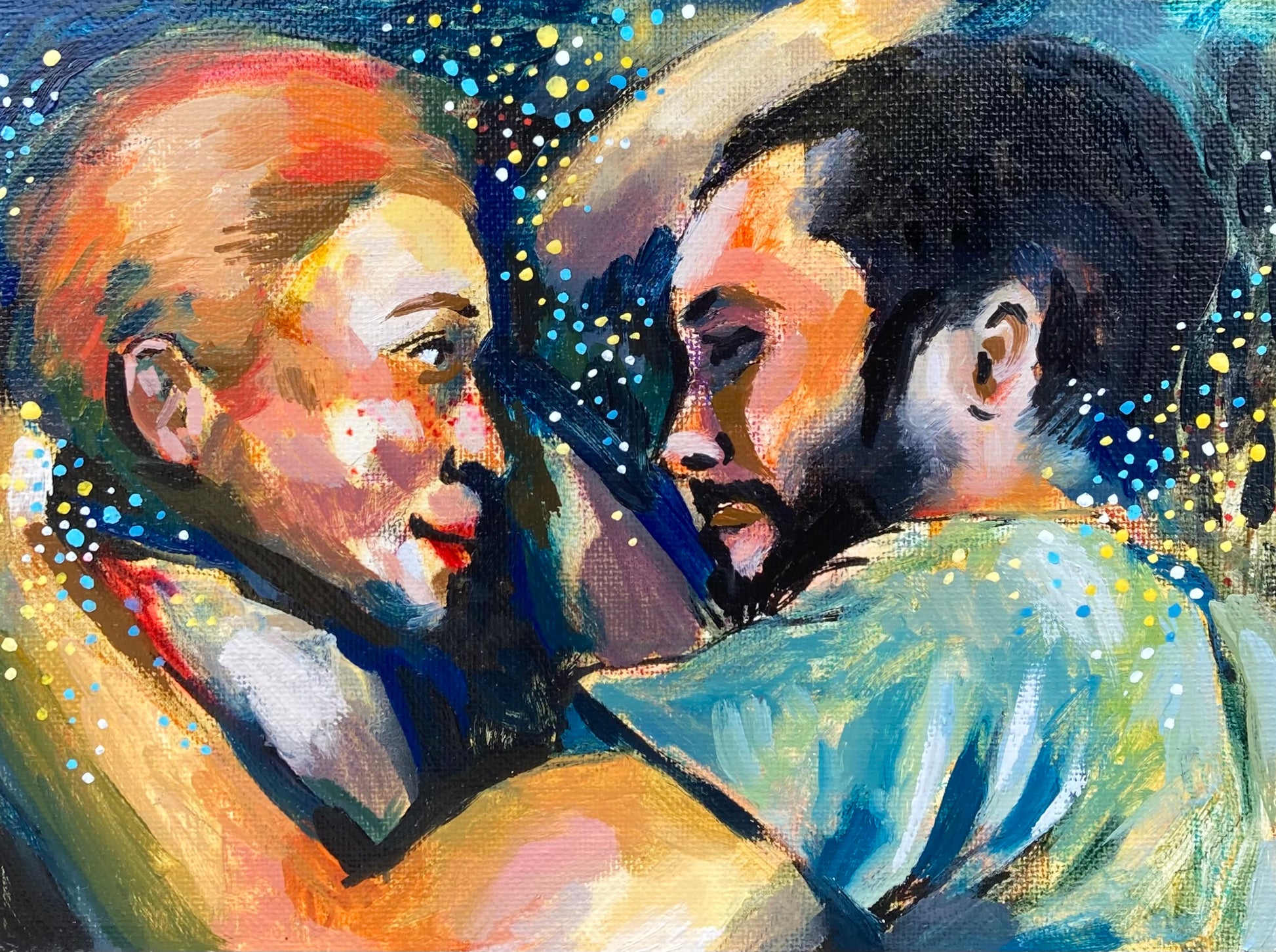 This original mixed media painting, created in 2021, evokes the complexity of love and loss through layers of vibrant color, intricate brushwork, and intimate detail. The couple portrayed, suspended in a quiet crossroads, invites you to feel the poignancy of a moment both fleeting and eternal—just as the song reminds us of moments we’ll always hold close.
