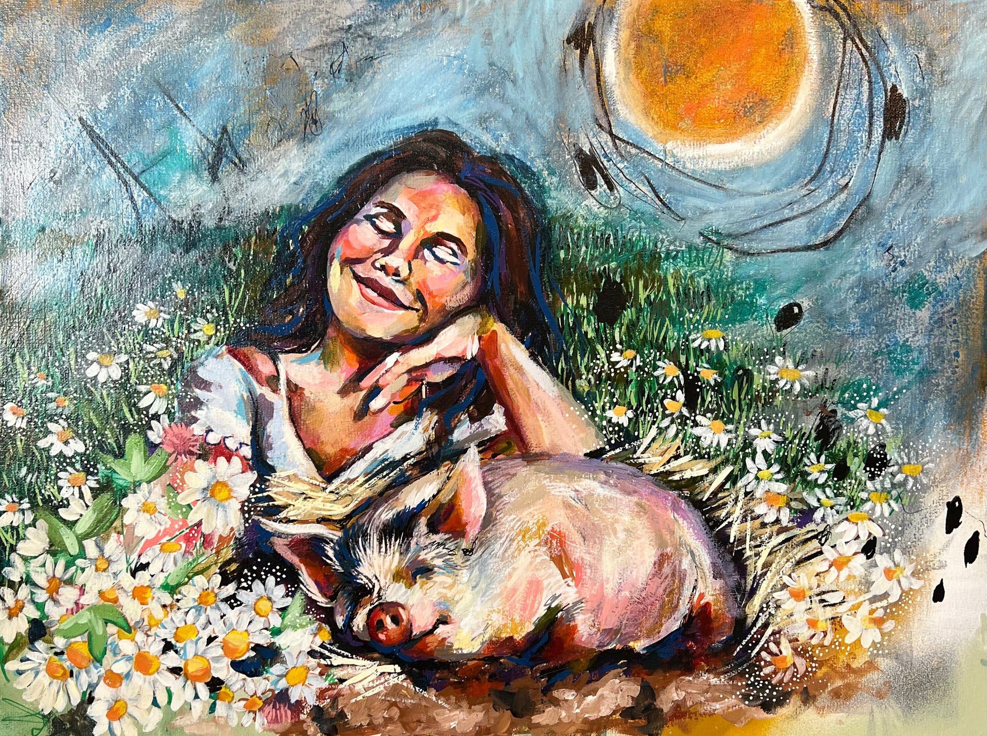 Let Us Be” is a heartfelt ode to harmony, connection, and the beauty of simply existing. This mixed media piece captures a serene moment of companionship between a woman and a pig, surrounded by vibrant daisies and the golden glow of a setting sun.