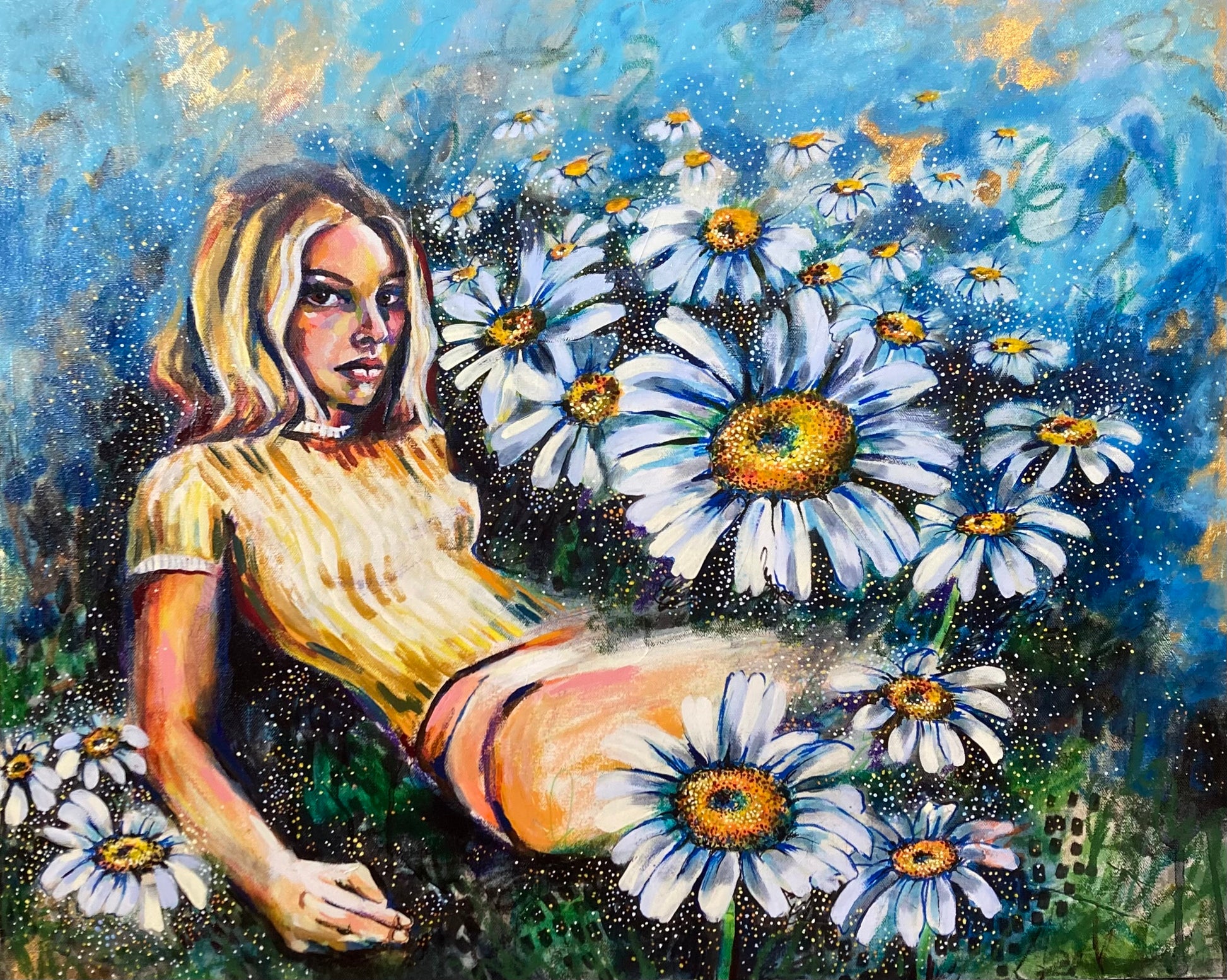 Night Weaver is a bold and enchanting piece from the Sugar Rush Series (2022), inviting you into a dreamlike moment surrounded by fields of luminous daisies. This painting explores themes of connection, inner light, and the delicate balance between groundedness and imagination. The figure reclines amidst glowing flowers, embodying a serene yet powerful presence that draws you in to reflect on your own journey.