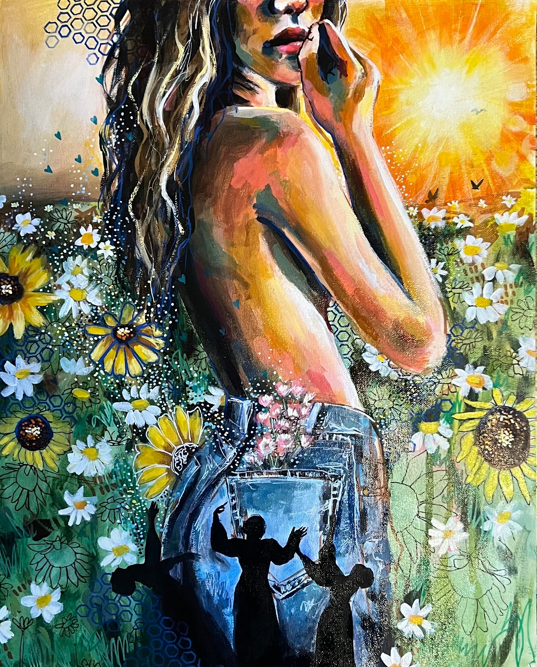 Sanguine is a vivid celebration of vitality and self-expression. Crafted with layered mixed media, this piece is an explosion of colour and texture, combining intricate linework, botanical elements, and luminous brushstrokes to create a dynamic interplay between light and emotion. The painting radiates an aura of optimism, drawing the viewer into a moment of warmth and connection.