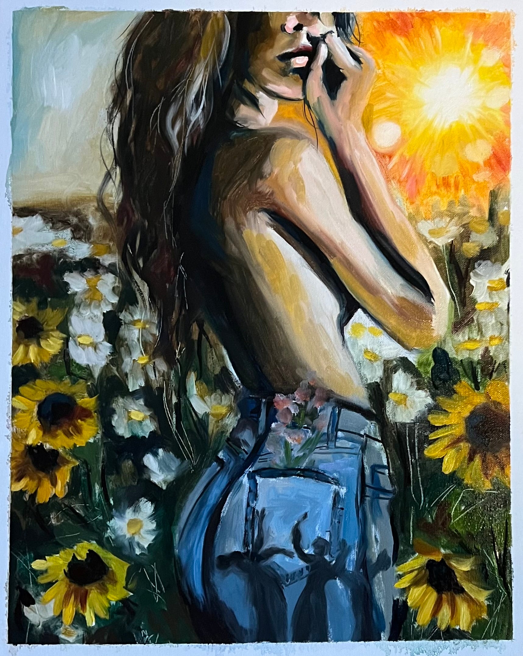 Shadow Dance offers an introspective interpretation of the its muse. Rendered in rich oil paints, this piece highlights the interplay of light and shadow, evoking a quiet, timeless beauty. With its softer palette and refined brushwork, the painting draws focus to the figure’s subtle grace and the organic harmony of the surrounding natural elements.