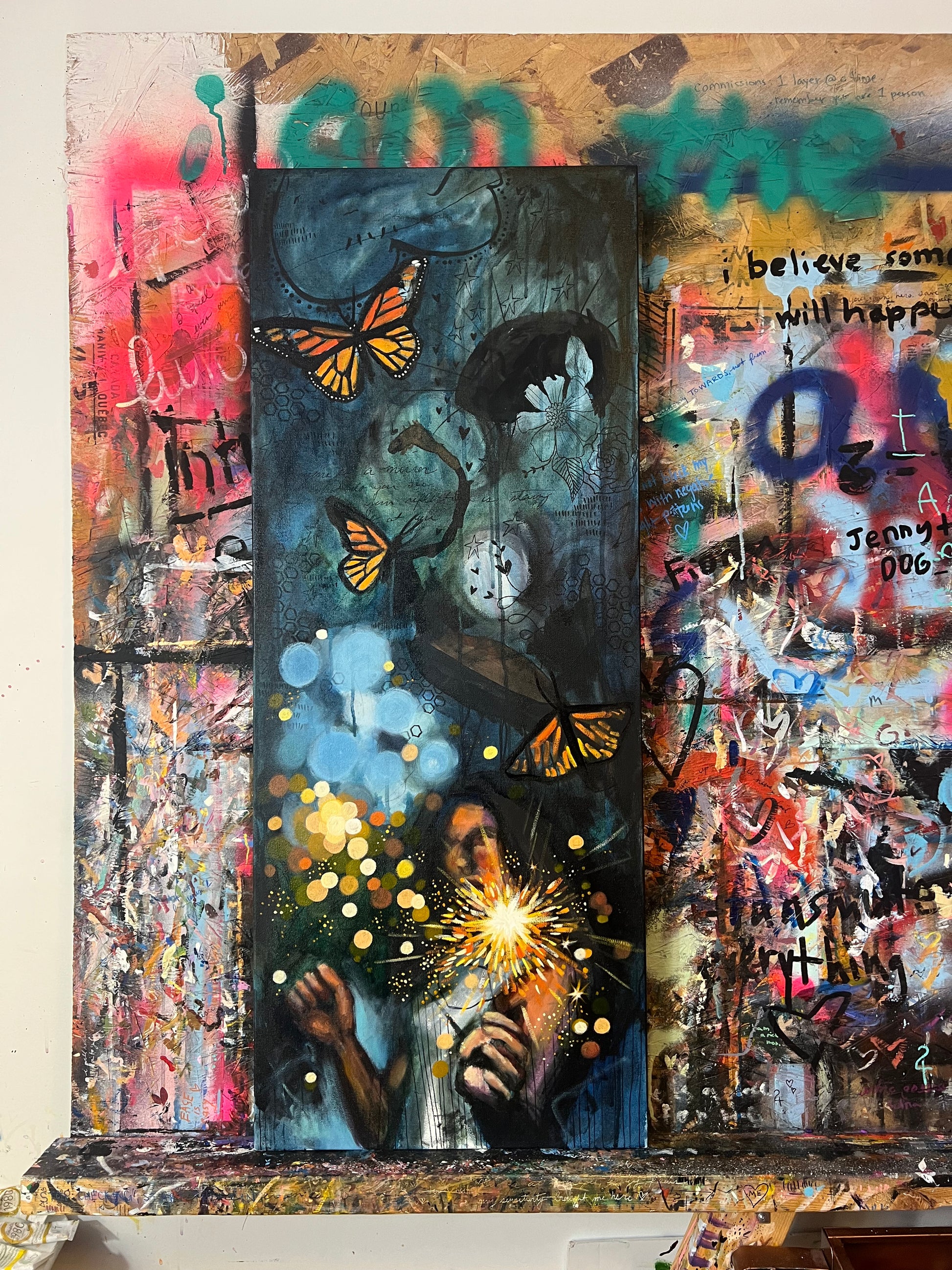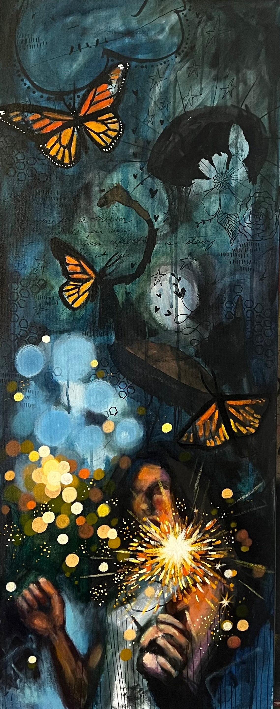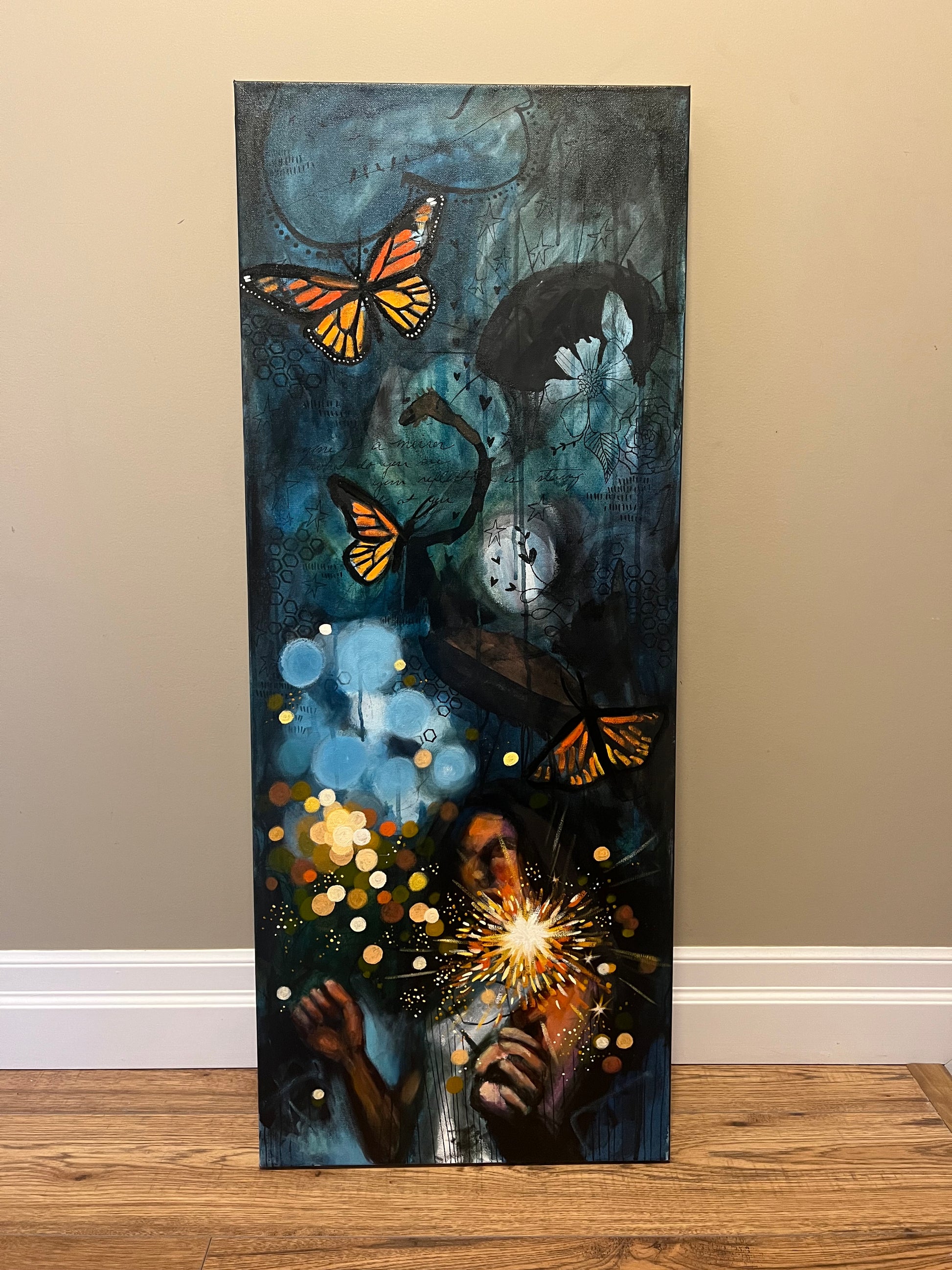 This incredibly special piece was created in collaboration with my seven year old son, Clifford. He helped with the initial mark-making and dynamic background that incorporates childlike wonder and imagination into every inch of this painting. This painting embodies everything that the year of the fire horse represents. The igniting of dreams and ideas and the magic that happens when it is lit! 🔥 🐎✨