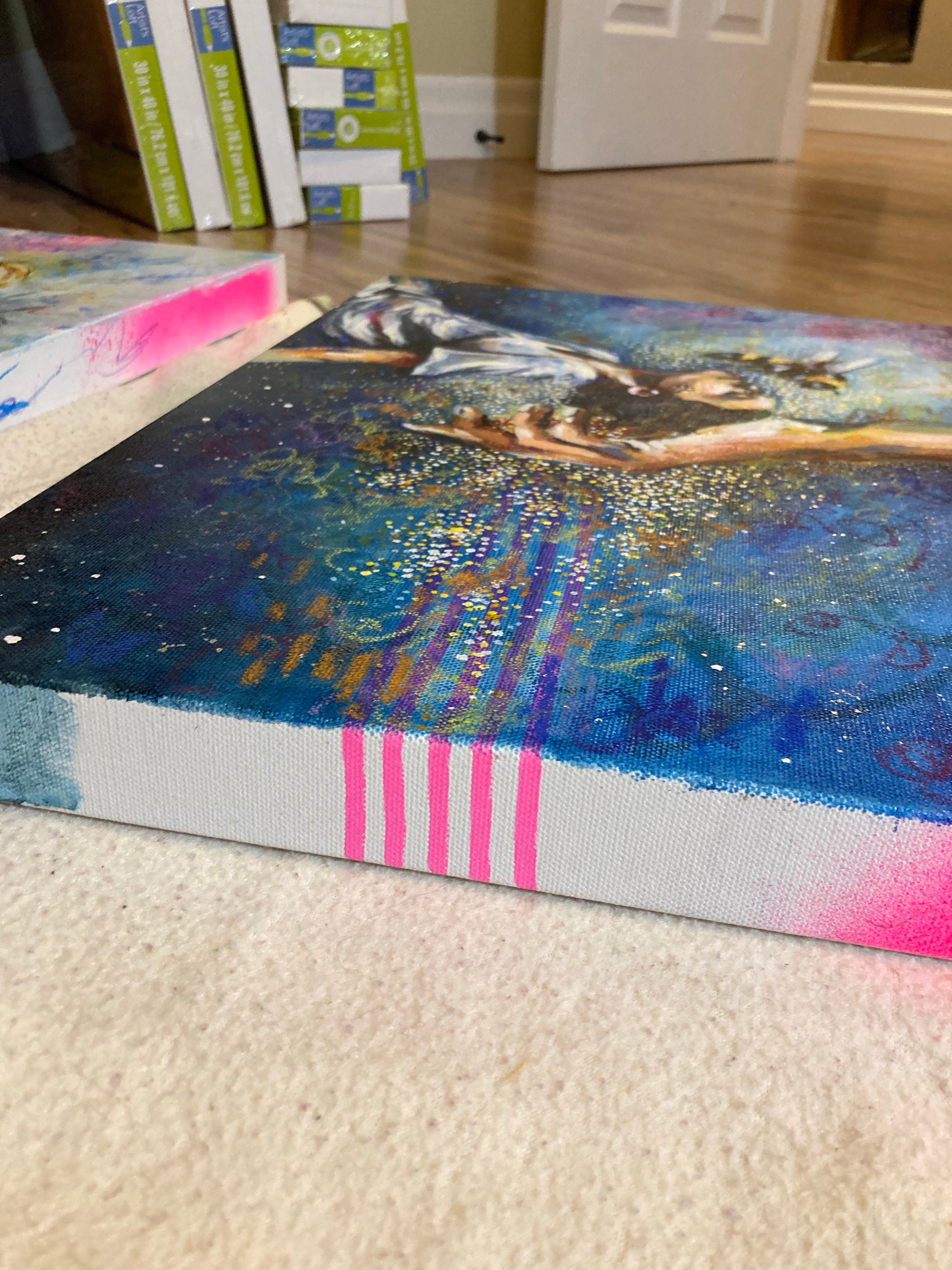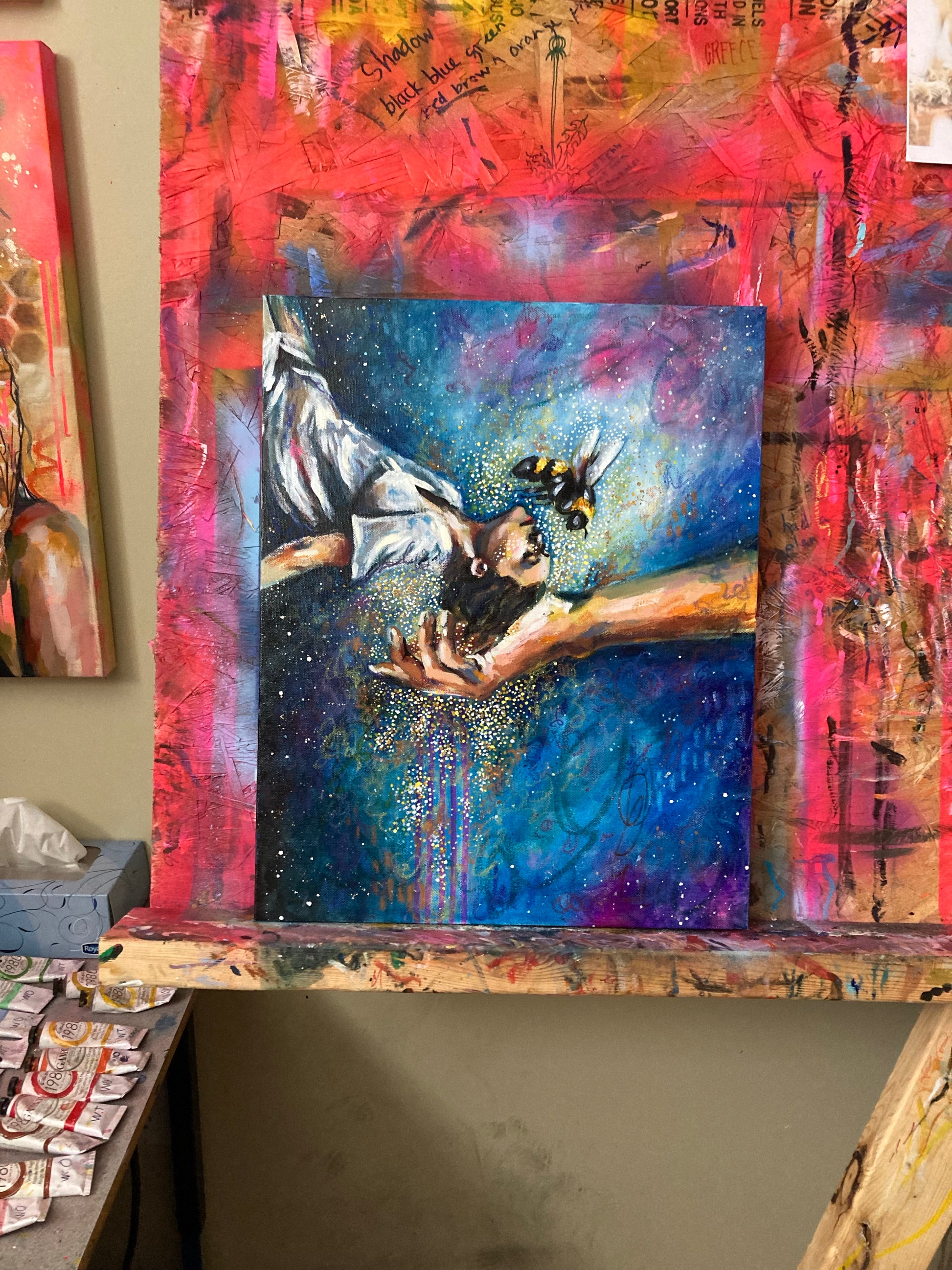 “Take Me to the Stars” is a vibrant exploration of connection, transformation, and the beauty of surrender. This painting captures a dreamlike moment of unity between humanity and nature, symbolized by a woman in repose, a bumblebee hovering delicately near her, and the ethereal stardust bridging their worlds.