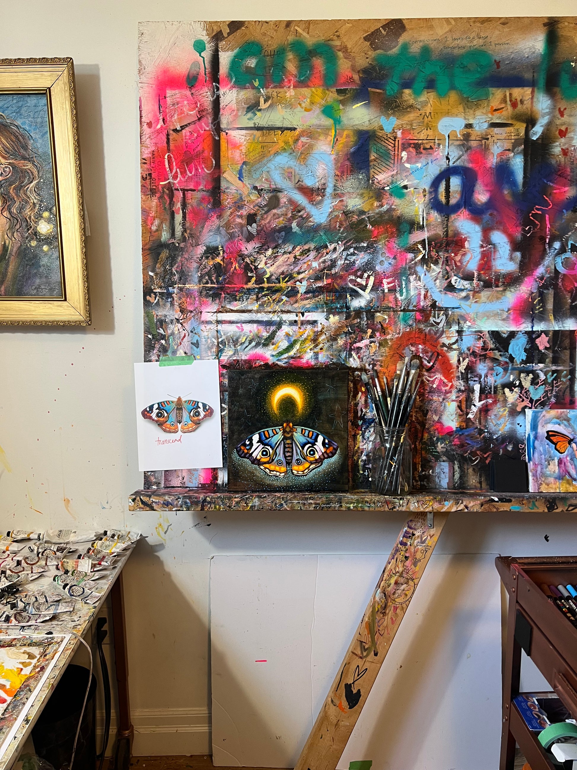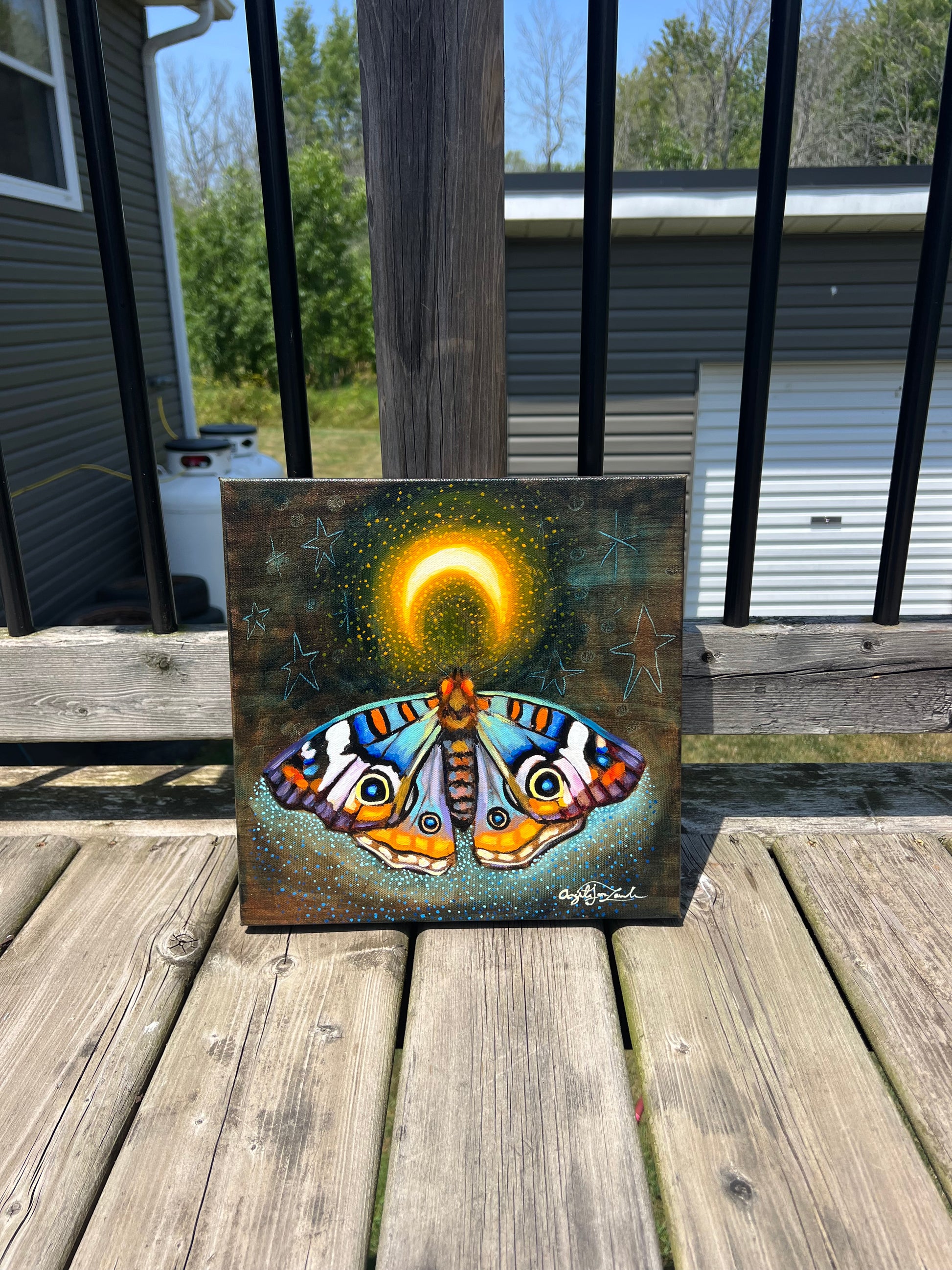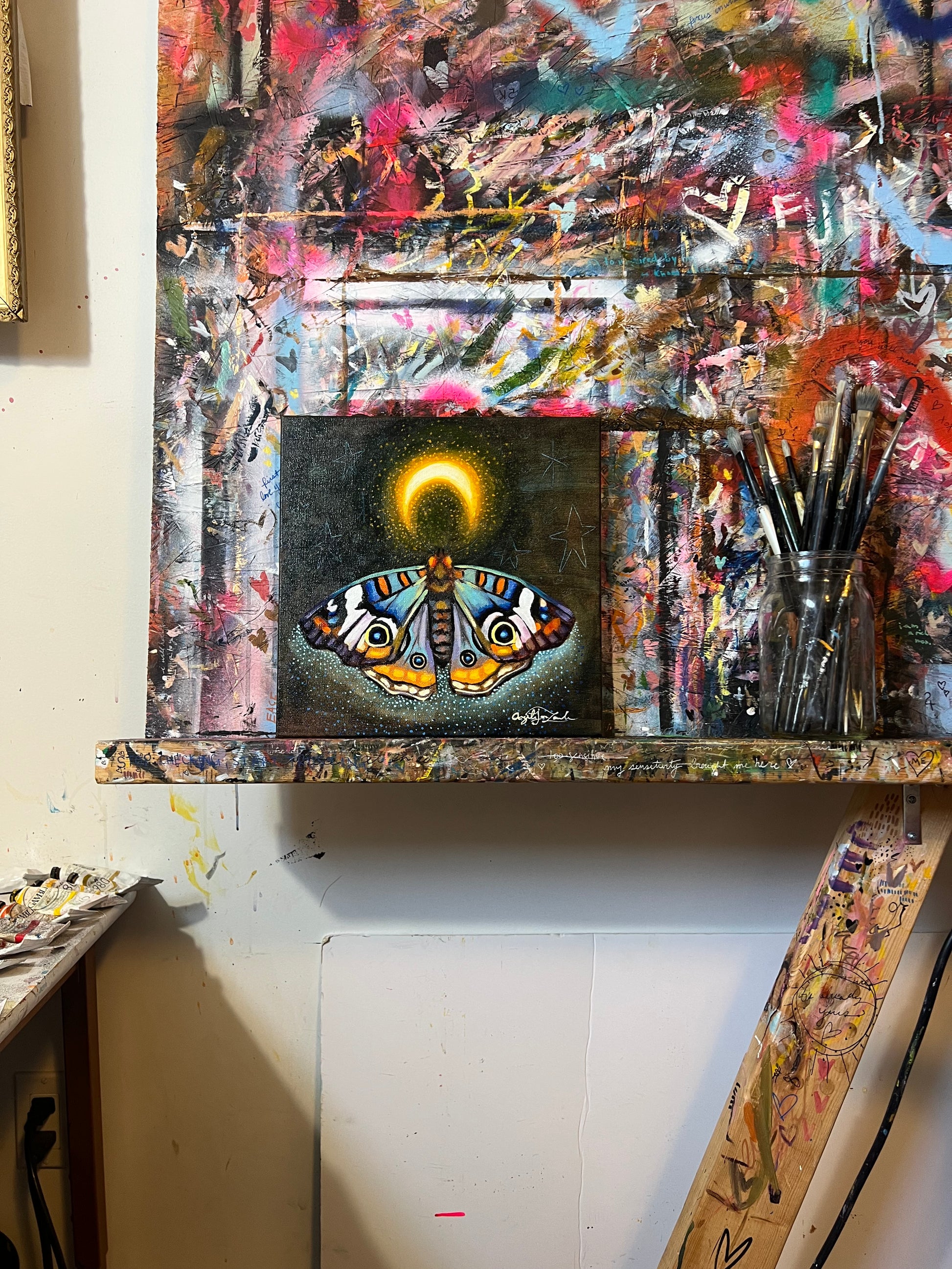 Transcend is a vibrant explosion of colour, depicting a fictitious moth that doesn’t exist in this realm. This piece was meant for someone who loves to romanticize their life and add whimsy in every corner of their home. The childlike stars carved into the background, the glowing light of the moon and the unwavering belief in the make believe is what makes this painting, and you, absolutely grand.