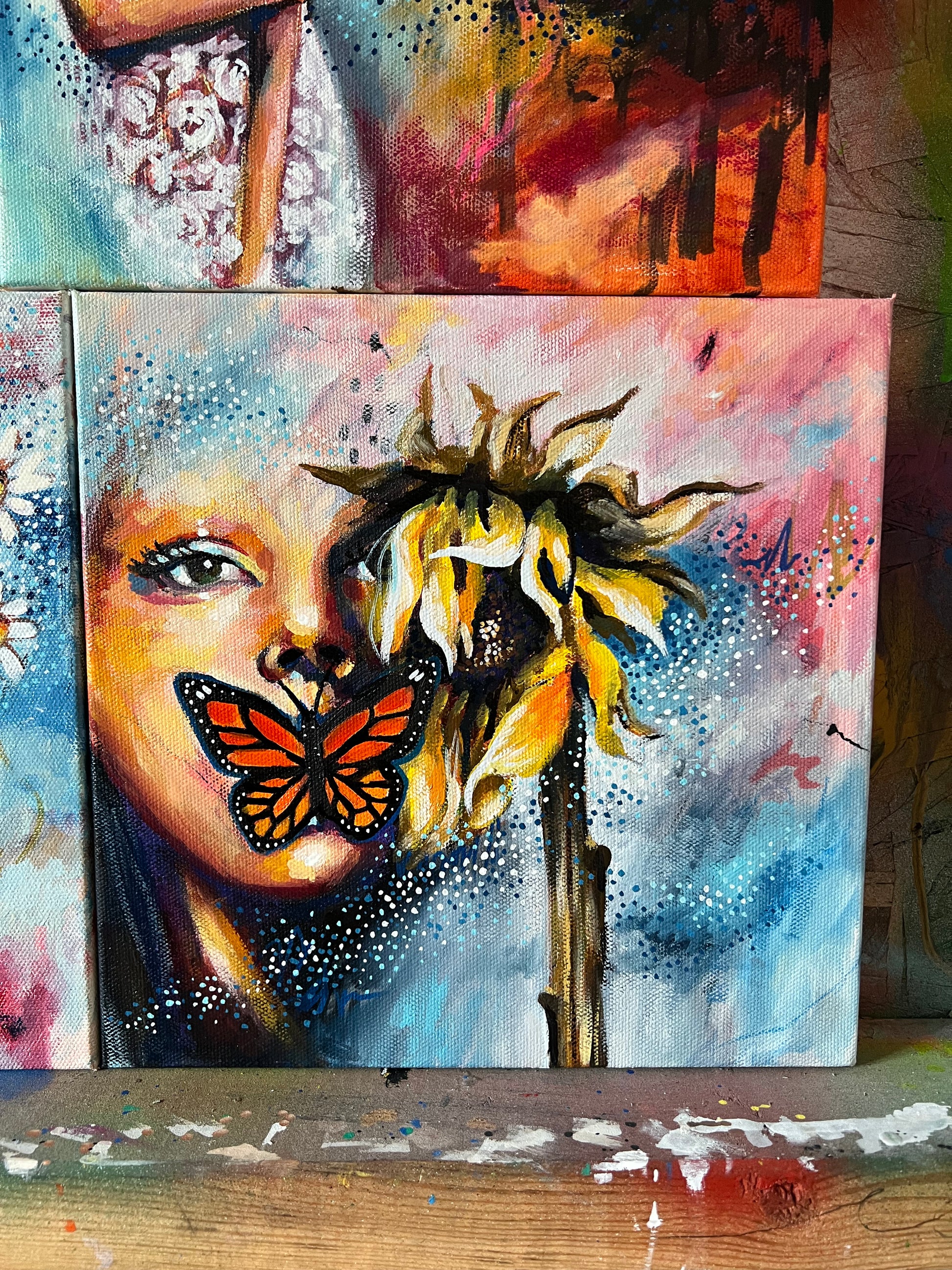 Transmigrate is a captivating mixed media painting that speaks to the delicate dance of transformation and continuity. The vibrant composition intertwines a fading sunflower, a monarch butterfly, and a human face, symbolising the cycles of life, death, and rebirth. Each brushstroke and dot carries the essence of metamorphosis—the butterfly as a harbinger of change, the sunflower as a symbol of resilience even in decay, and the human spirit as a constant witness to this eternal cycle.