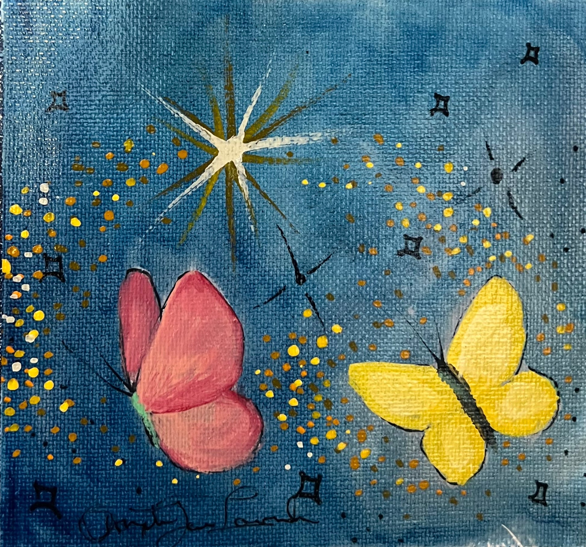 Set against a deep celestial sky, two butterflies, flutter toward a shared light. The yellow butterfly often symbolizes hope, renewal, and the presence of a guiding spirit, while the pink butterfly represents love, compassion, and emotional healing. Together, they speak to the power of connection, the beauty of partnership, and the magic that happens when two souls uplift one another.