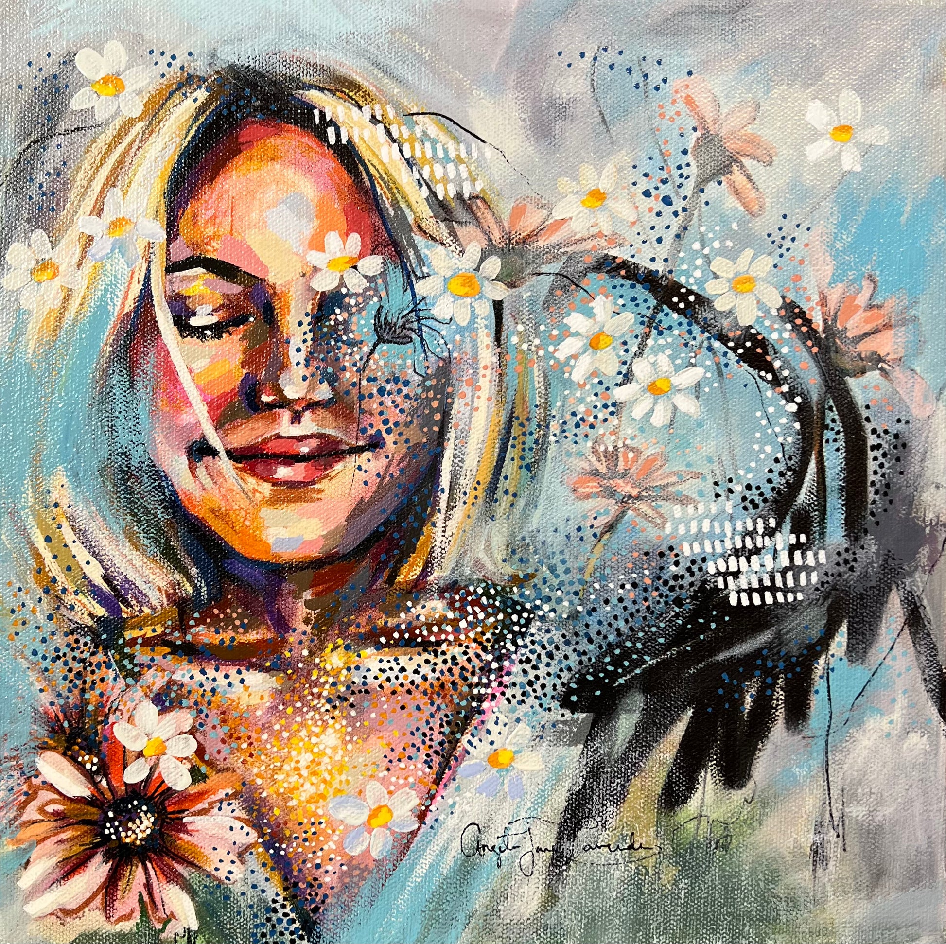 “Calm” invites you into a serene moment of self-reflection and gentle connection. Through delicate daisies, soft hues, and intricate details, this painting embodies the quiet beauty of finding peace within. The layers of texture and light create a meditative experience, reminding you to pause, breathe, and embrace your inner calm.