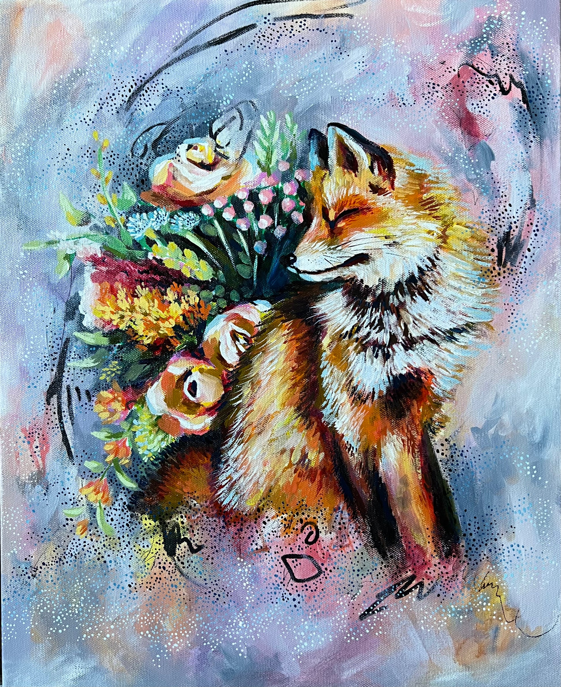 This painting radiates the essence of charisma—a magnetic energy that draws others in without explanation. Featuring a serene fox surrounded by an exuberant bouquet of flowers, Charisma captures the quiet confidence of being truly aligned with oneself.