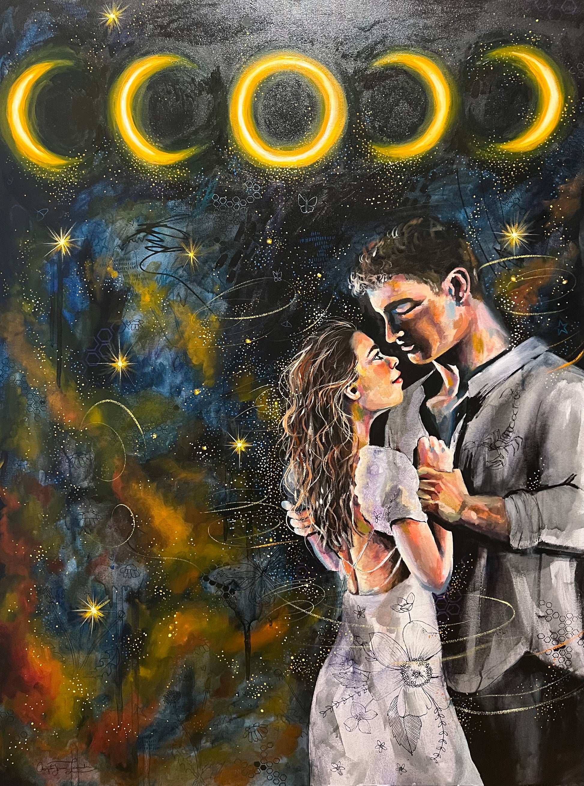 At its core, this piece tells the story of two souls drawn together, as if by the hand of fate. The swirling stars and intricate patterns represent the unseen energy that connects us, creating a scene that feels timeless and deeply meaningful.