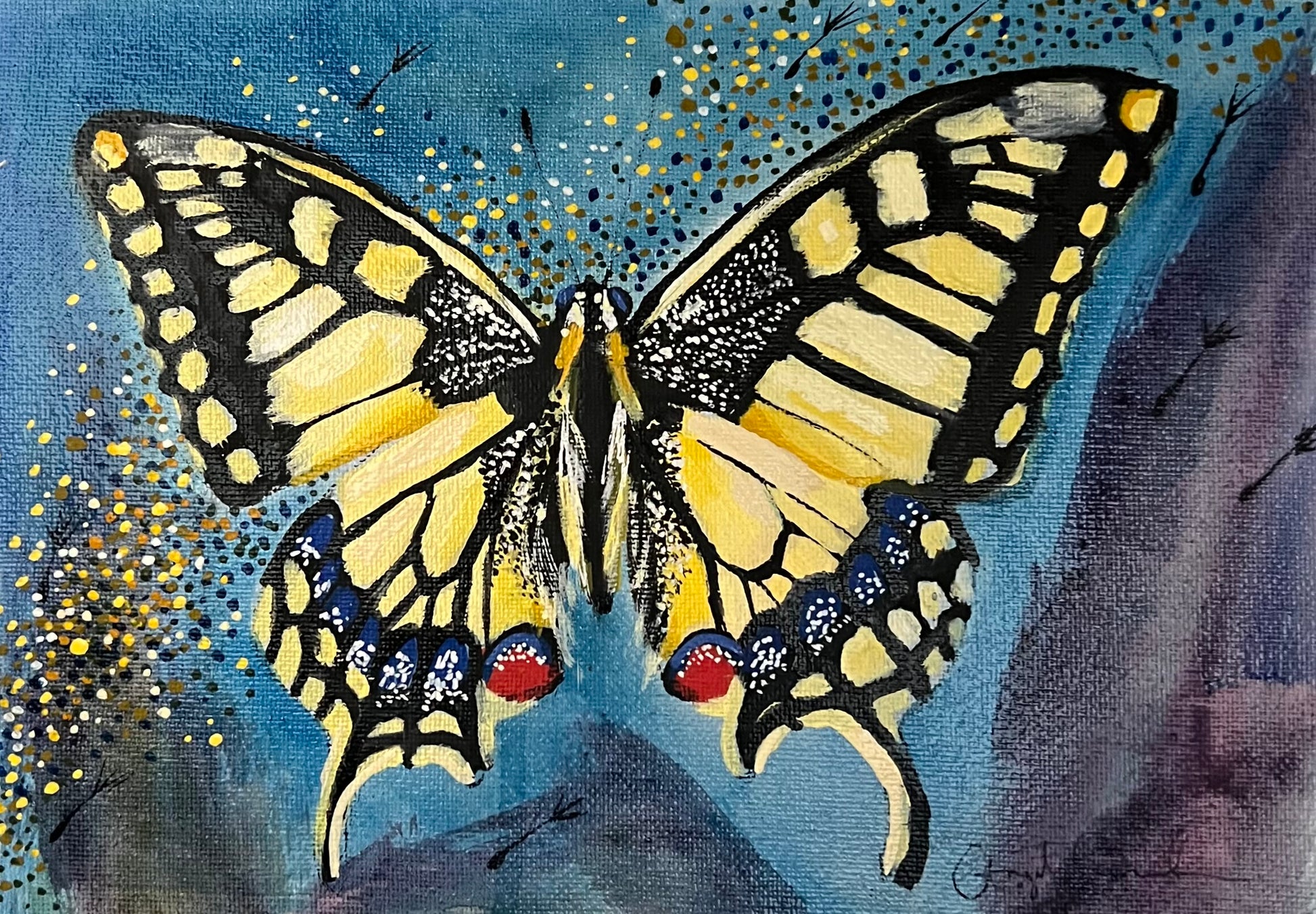 This piece features an Eastern Tiger Swallowtail, a butterfly known for its bold beauty and symbolism of personal transformation, joy, and resilience. Its golden wings and vibrant markings remind us that even the most delicate beings can carry powerful messages.