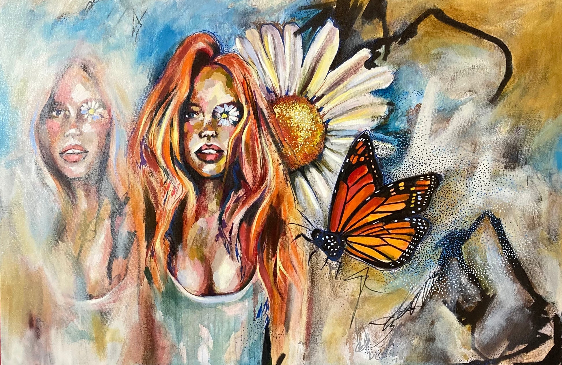Eclipse is a large-scale mixed media painting exploring themes of identity and perception. Through the interplay of bold colours, delicate florals, and the vibrant monarch butterfly, this piece reflects the contrast between how we see ourselves and how others define us in their stories. The quote it draws inspiration from reminds us that our true essence remains untouched by outside narratives. This artwork invites you to pause and reconnect with your authentic self amidst the noise of perception.