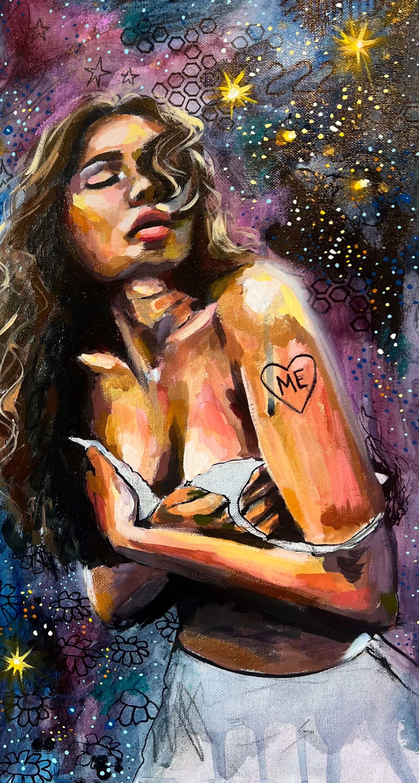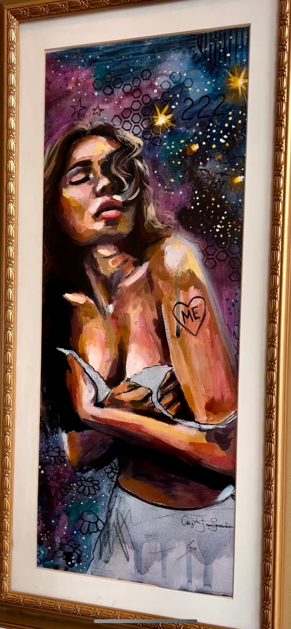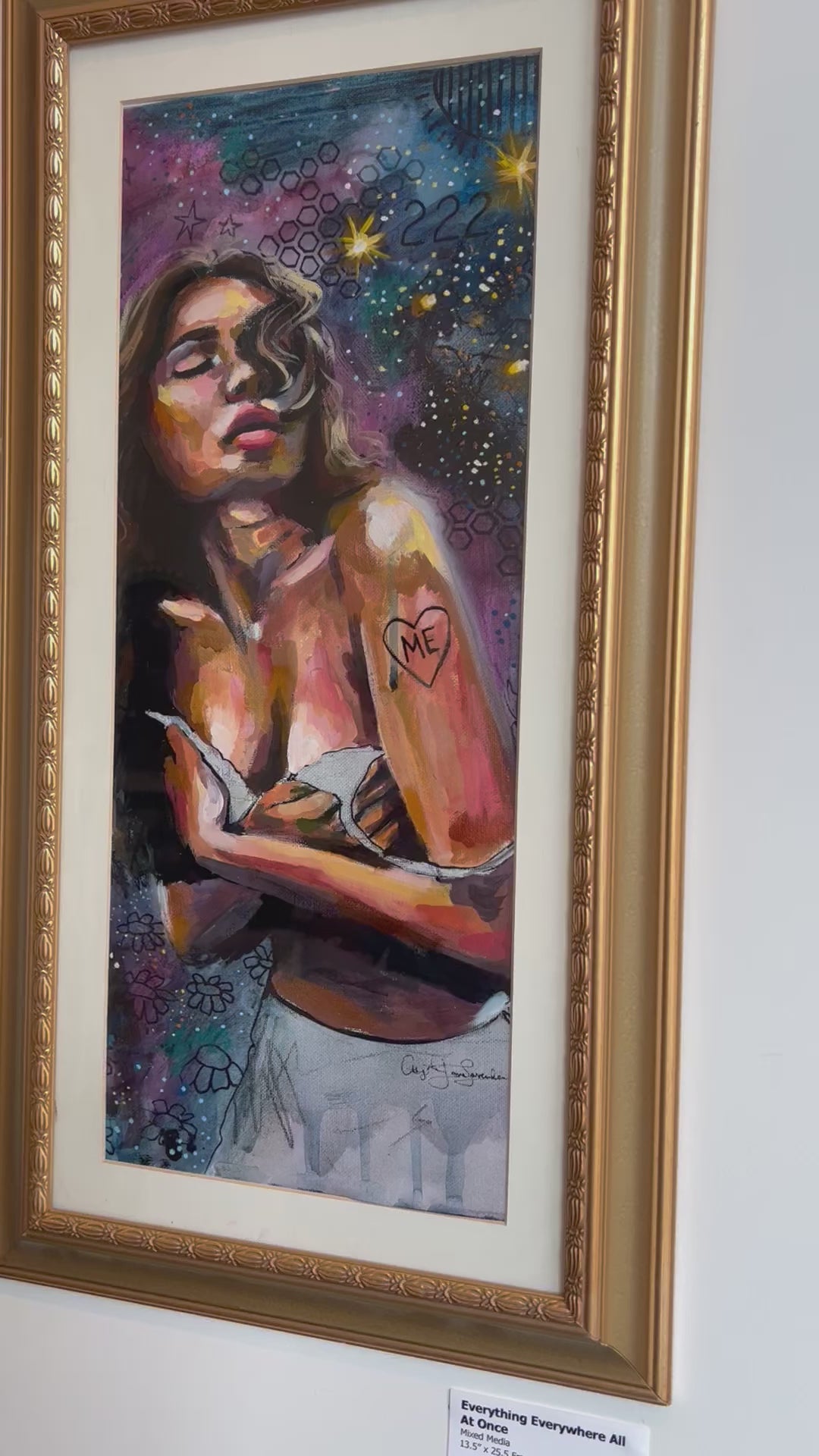 “Everything Everywhere All At Once” is a 2024 mixed media painting that invites you to explore the vast spectrum of self-love, identity, and the universe’s interconnectedness. Framed in an elegant gold-toned frame, this piece is a stunning celebration of individuality and resilience. The bold tattoo reading ‘ME’ on the subject’s arm symbolizes self-prioritization and empowerment, while the cosmic background suggests infinite possibilities and the boundless potential within all of us.