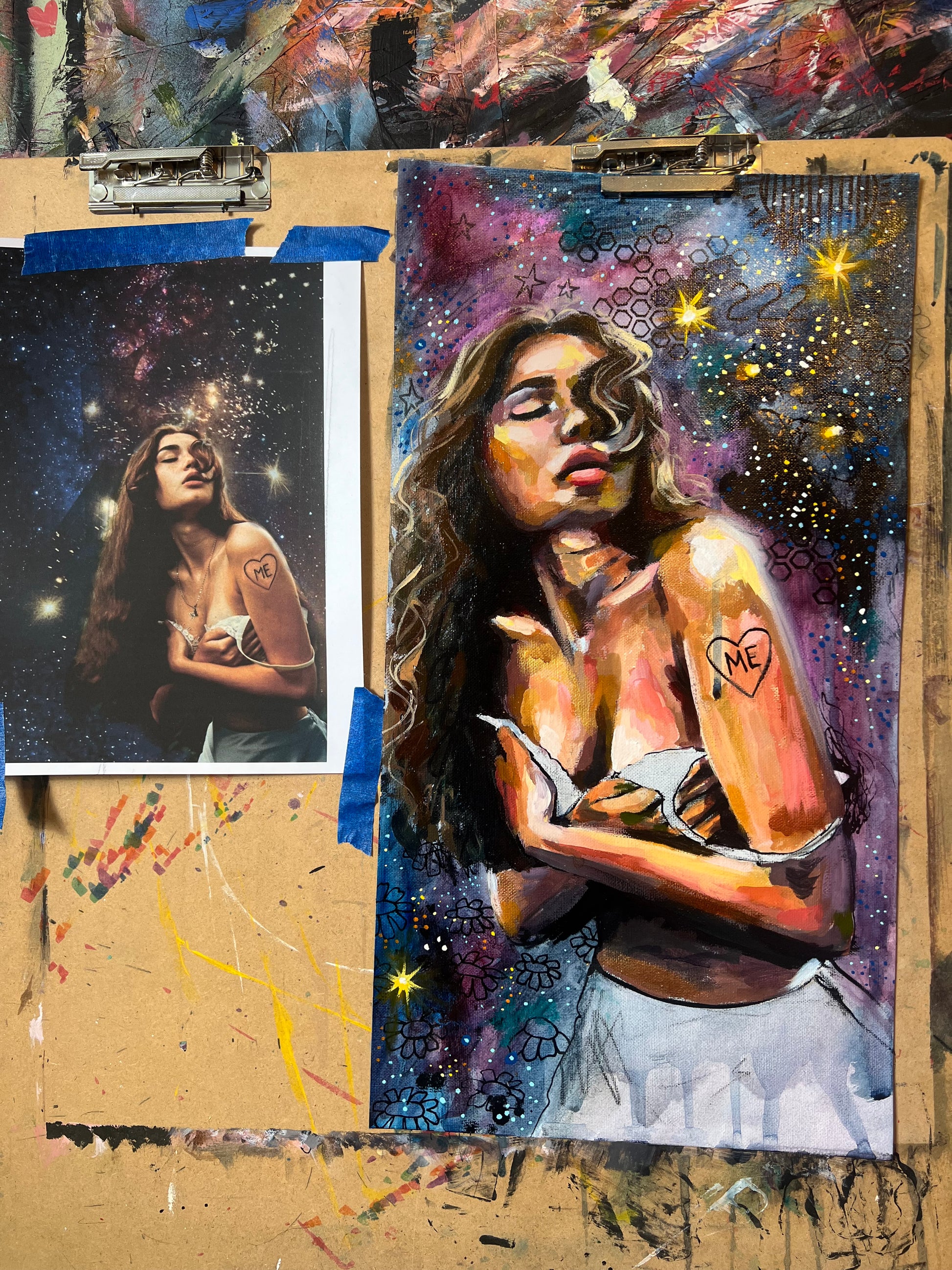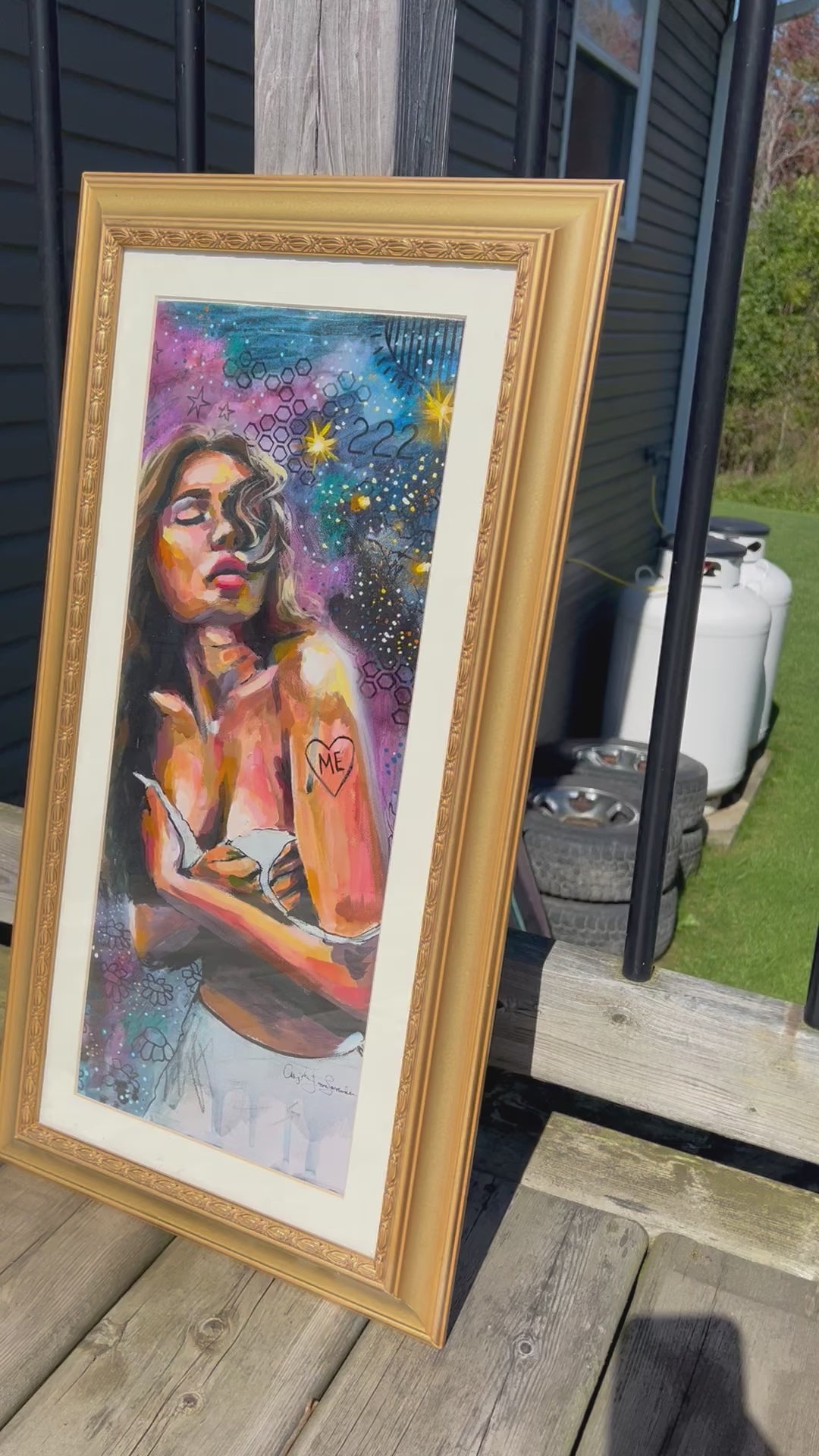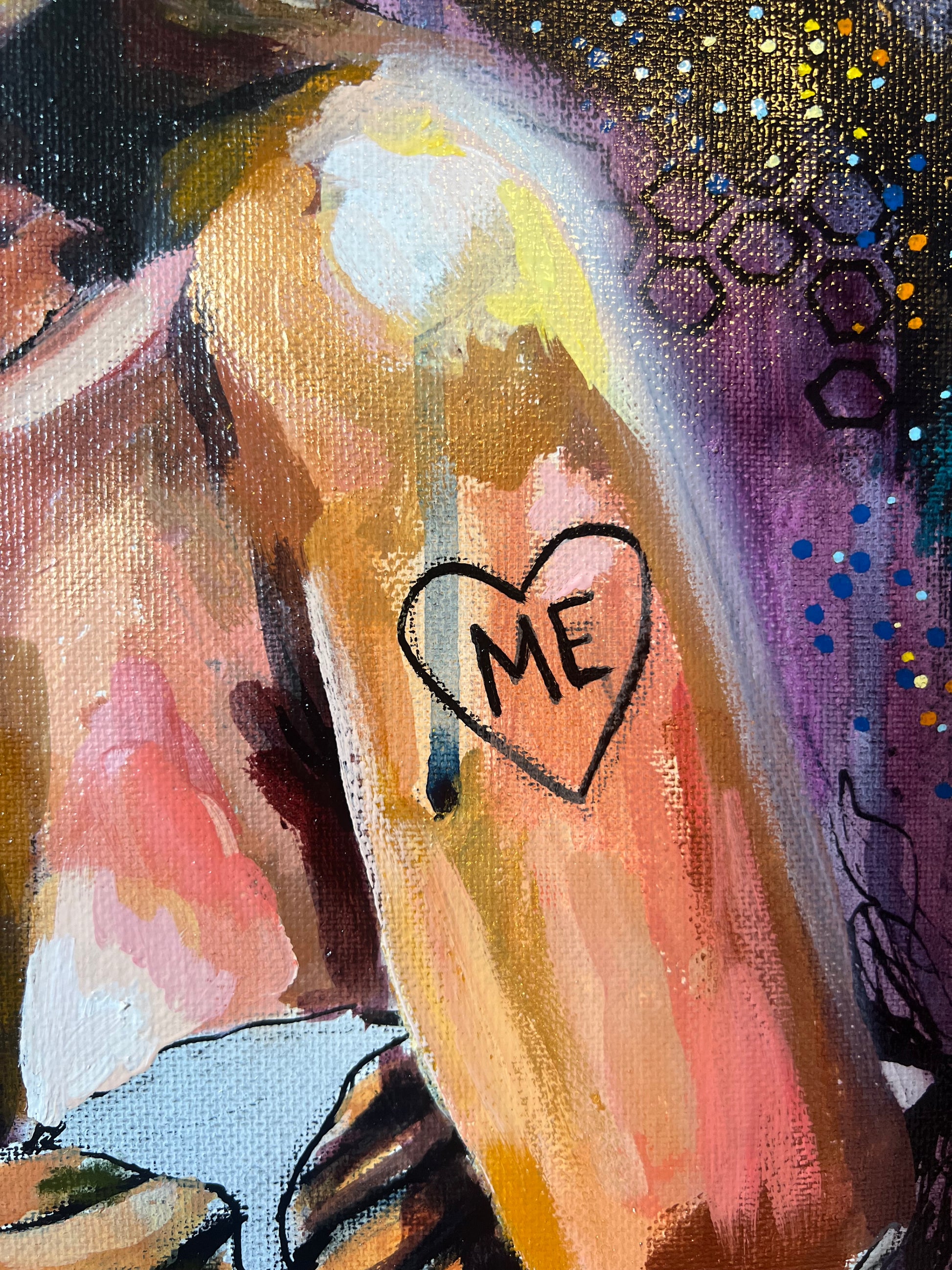“Everything Everywhere All At Once” is a 2024 mixed media painting that invites you to explore the vast spectrum of self-love, identity, and the universe’s interconnectedness. Framed in an elegant gold-toned frame, this piece is a stunning celebration of individuality and resilience. The bold tattoo reading ‘ME’ on the subject’s arm symbolizes self-prioritization and empowerment, while the cosmic background suggests infinite possibilities and the boundless potential within all of us.