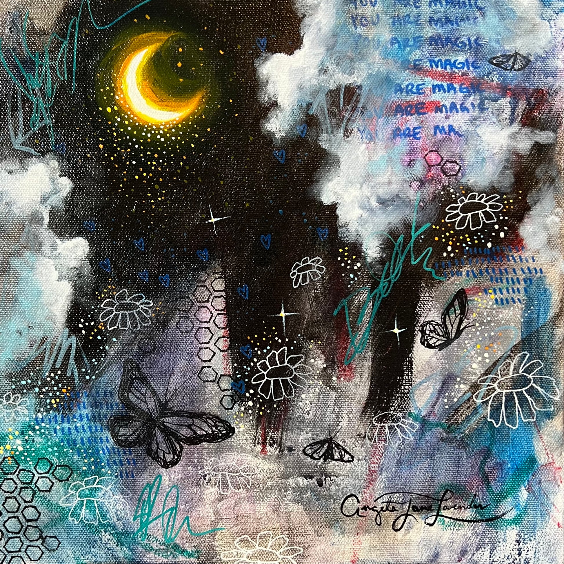 “Granted” is a vibrant mixed-media artwork that invites you to embrace the magic within yourself. This expressive piece features intricate line work, textured layers, and a dynamic colour palette, creating a dreamscape of glowing moons, delicate butterflies, and symbolic flowers. A harmony of bold marks and gentle patterns encourages viewers to reflect on their connection to the universe and the stardust that binds us all. Let “Granted” inspire you to face your light and shine brightly.