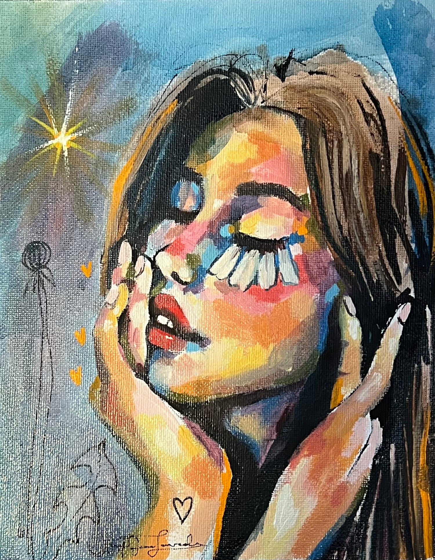 Wearing tenderness like armour, Heart on My Sleeve captures the raw beauty of feeling deeply in a world that often asks us to toughen up. With her eyes closed and lashes made of daisies, she leans inward; toward softness, toward trust, toward her own vibrant truth. Painted with a symphony of layered colour and delicate line work, this piece speaks to the strength in vulnerability and the magic that unfolds when we stop hiding our hearts.