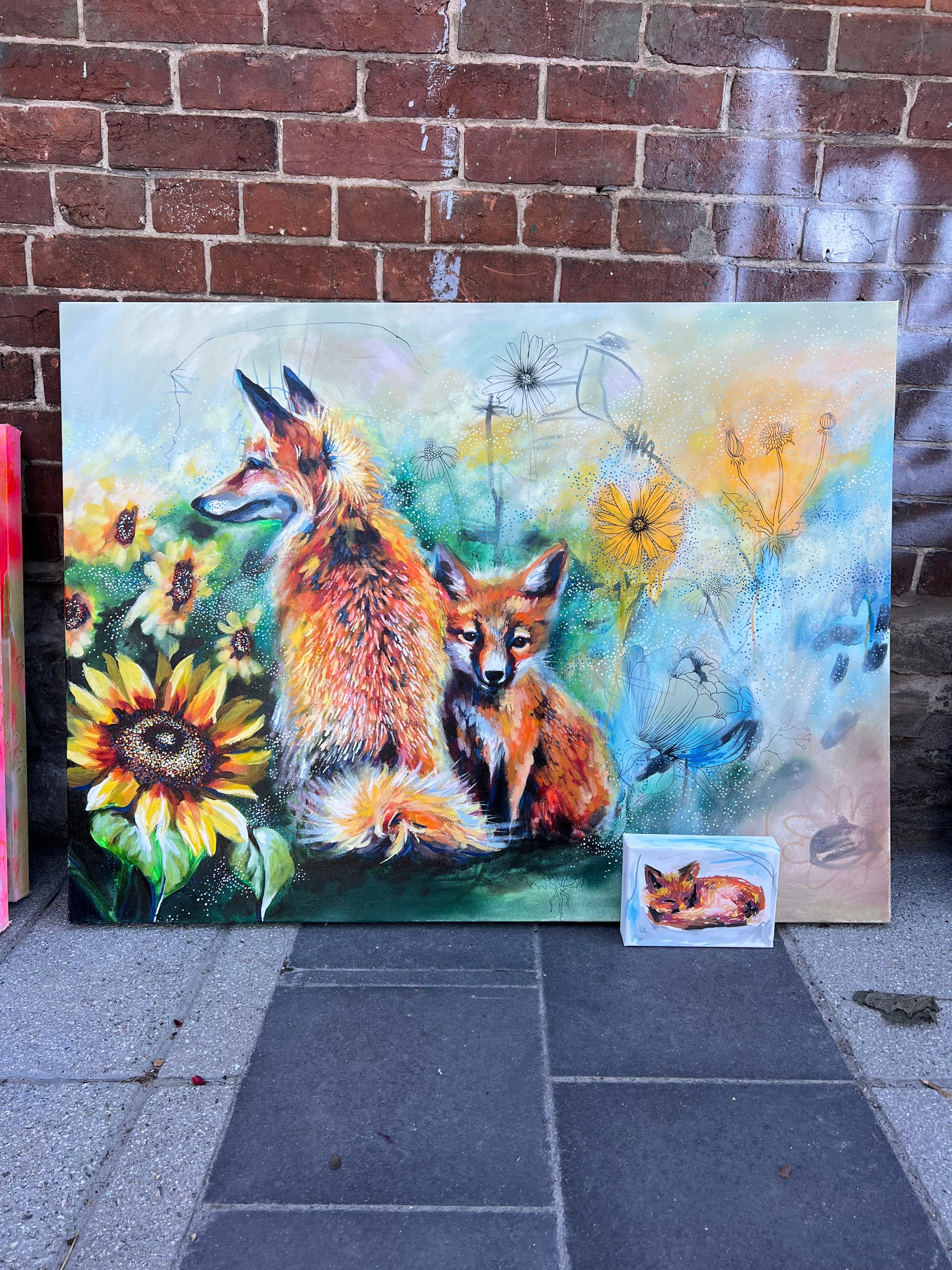 This captivating painting invites you into a serene world where nature’s harmony is on full display. Featuring a pair of foxes nestled among vibrant sunflowers and intricate botanical details, the piece evokes feelings of connection, intuition, and tranquillity. The fox, a symbol of adaptability and cleverness, paired with the radiant strength of sunflowers, creates a story of resilience and warmth.