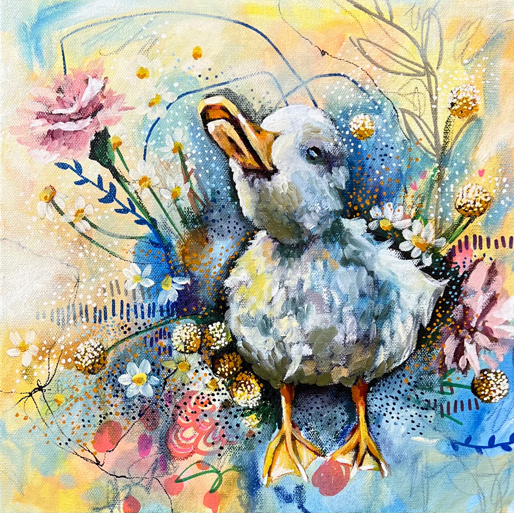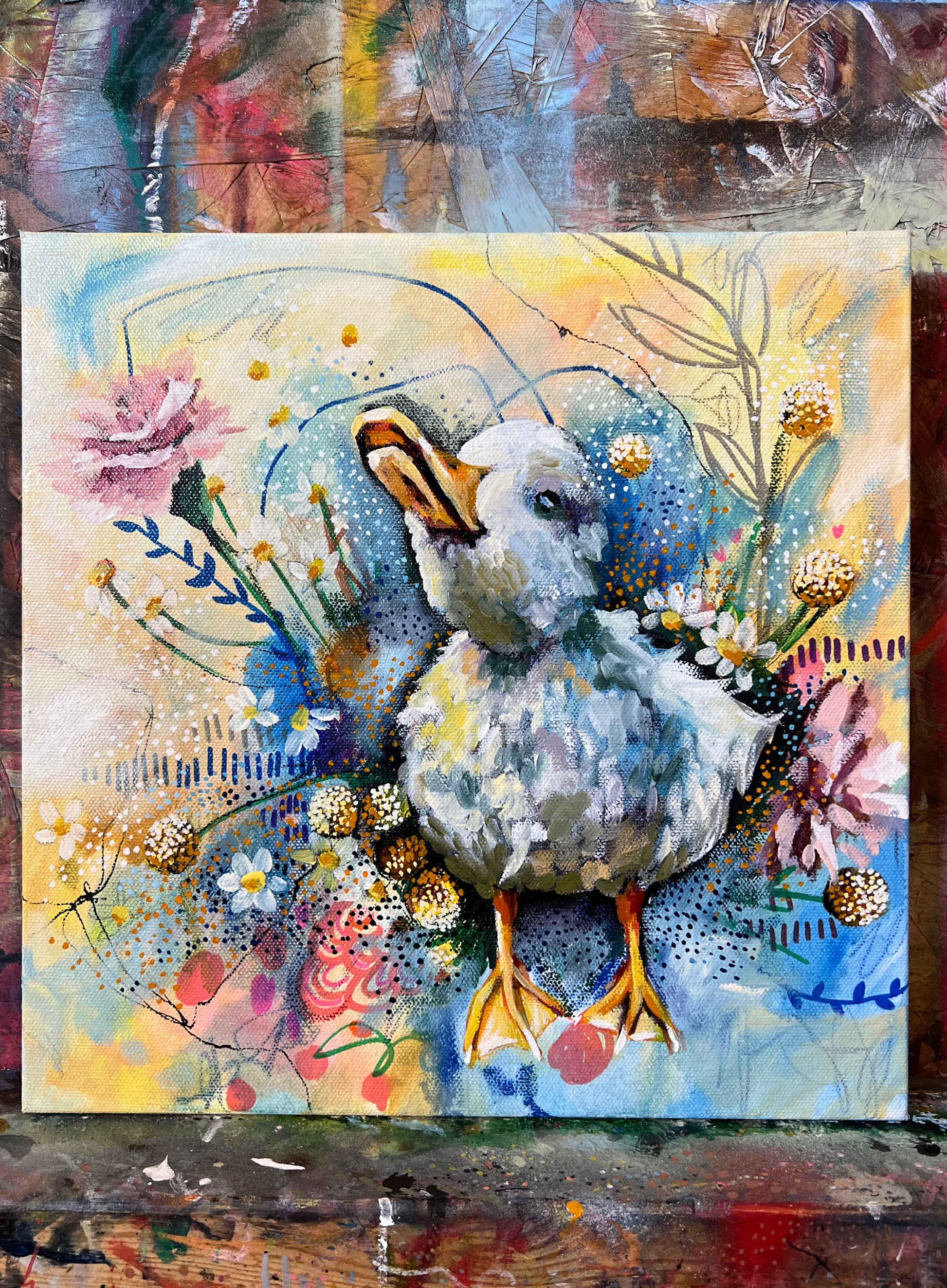 Living Thing challenges the way we perceive animals, urging us to see them not as commodities but as sentient, living beings. Featuring a playful duck surrounded by wildflowers, this piece reminds us of the beauty and vibrancy of life in its purest form.