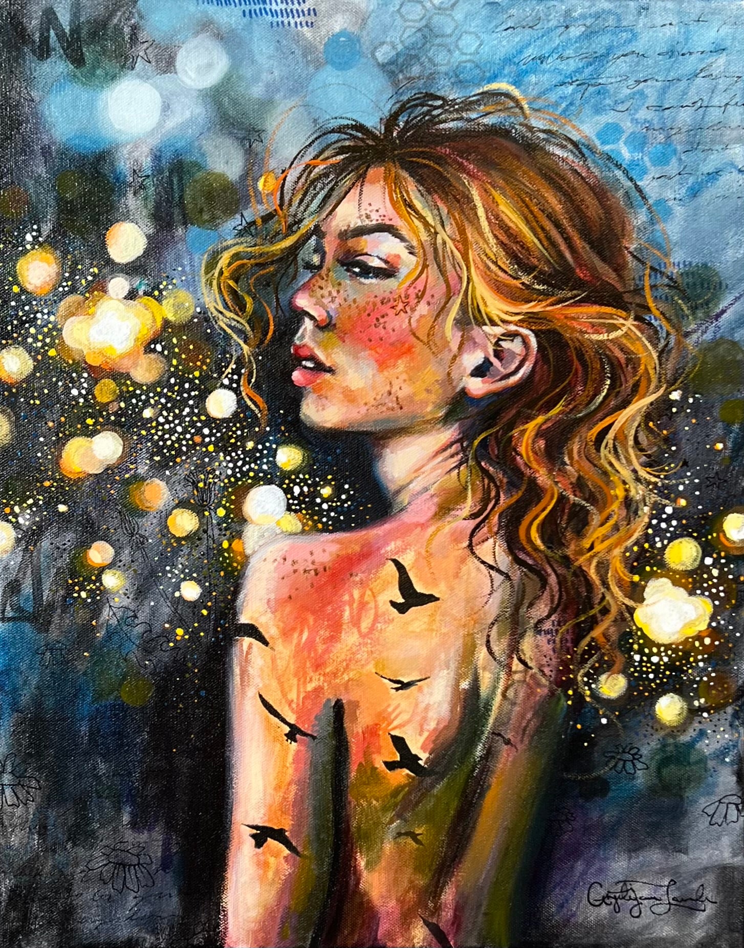 “Main Character” celebrates individuality, transformation, and inner strength. This striking piece depicts a radiant figure, her body adorned with flying birds that represent freedom and growth, while glowing orbs surround her, reflecting the magic and energy we each carry within.