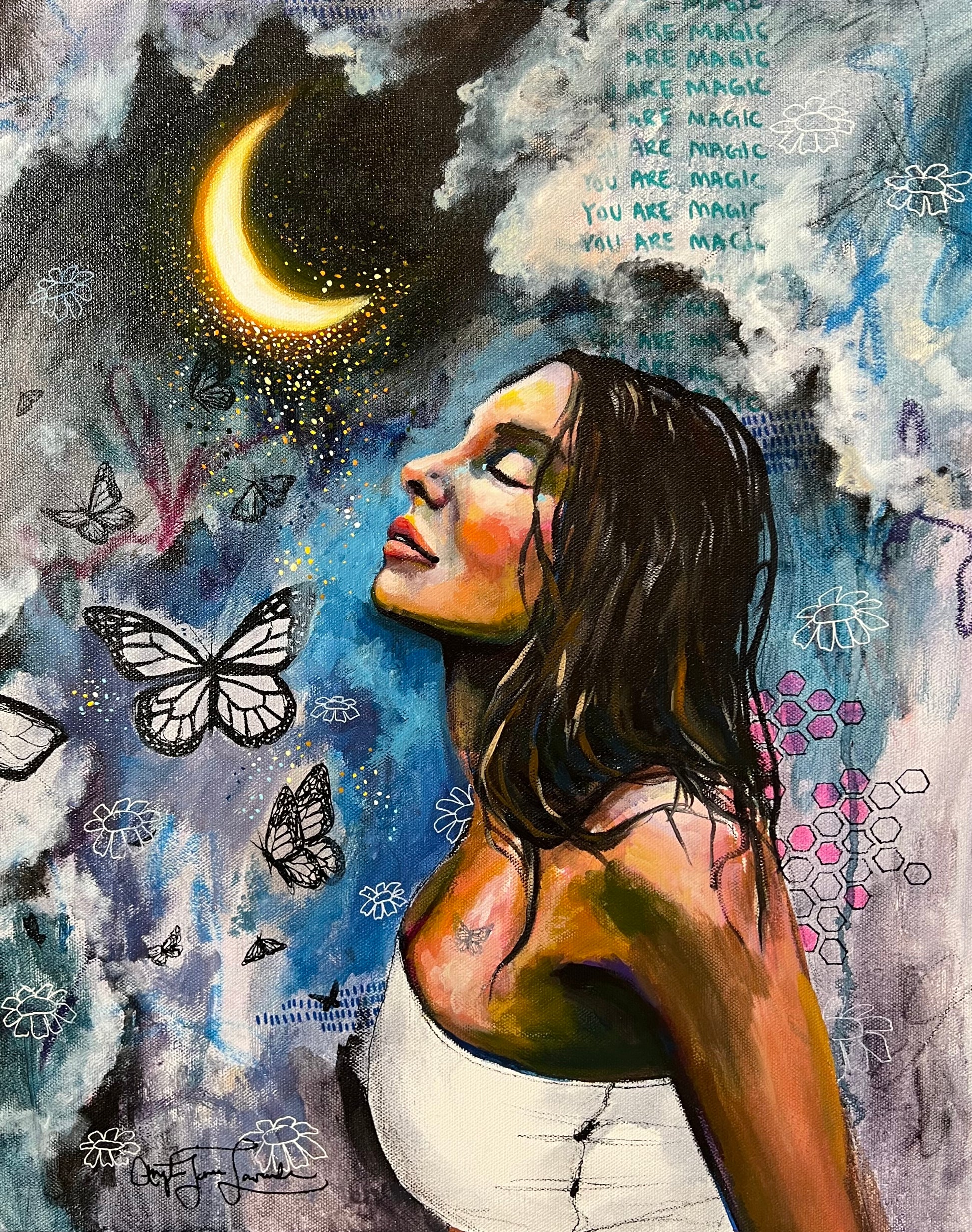“Moonkissed” captures a transformative moment of connection with the cosmos. A woman tilts her face toward a glowing crescent moon, bathed in ethereal light and surrounded by fluttering butterflies and delicate flowers. This piece radiates serenity, wonder, and self-realization, with the words “You Are Magic” woven into the dreamy composition, serving as a mantra of empowerment and self-love.