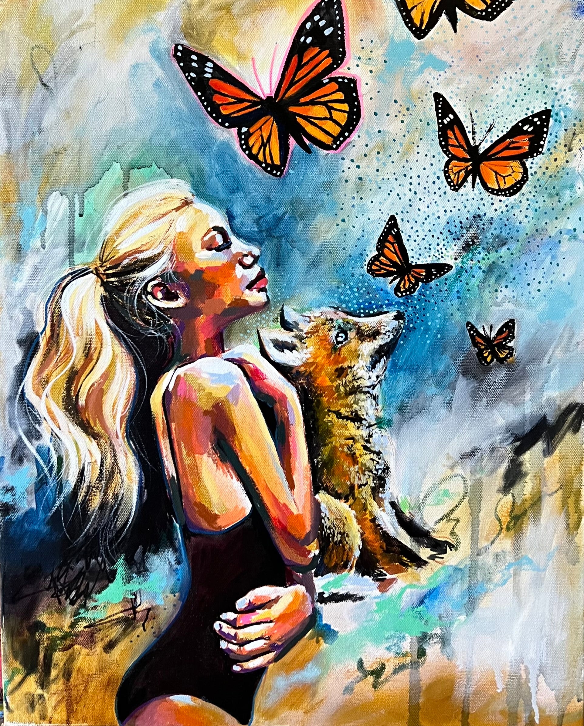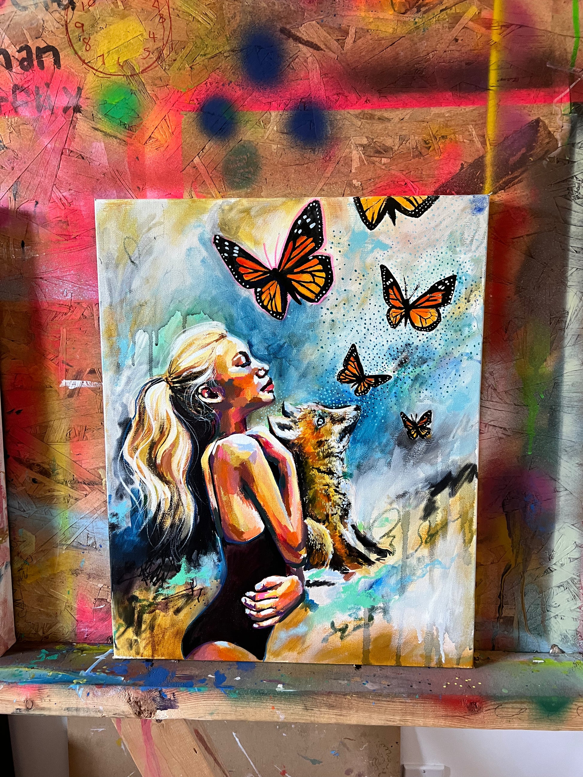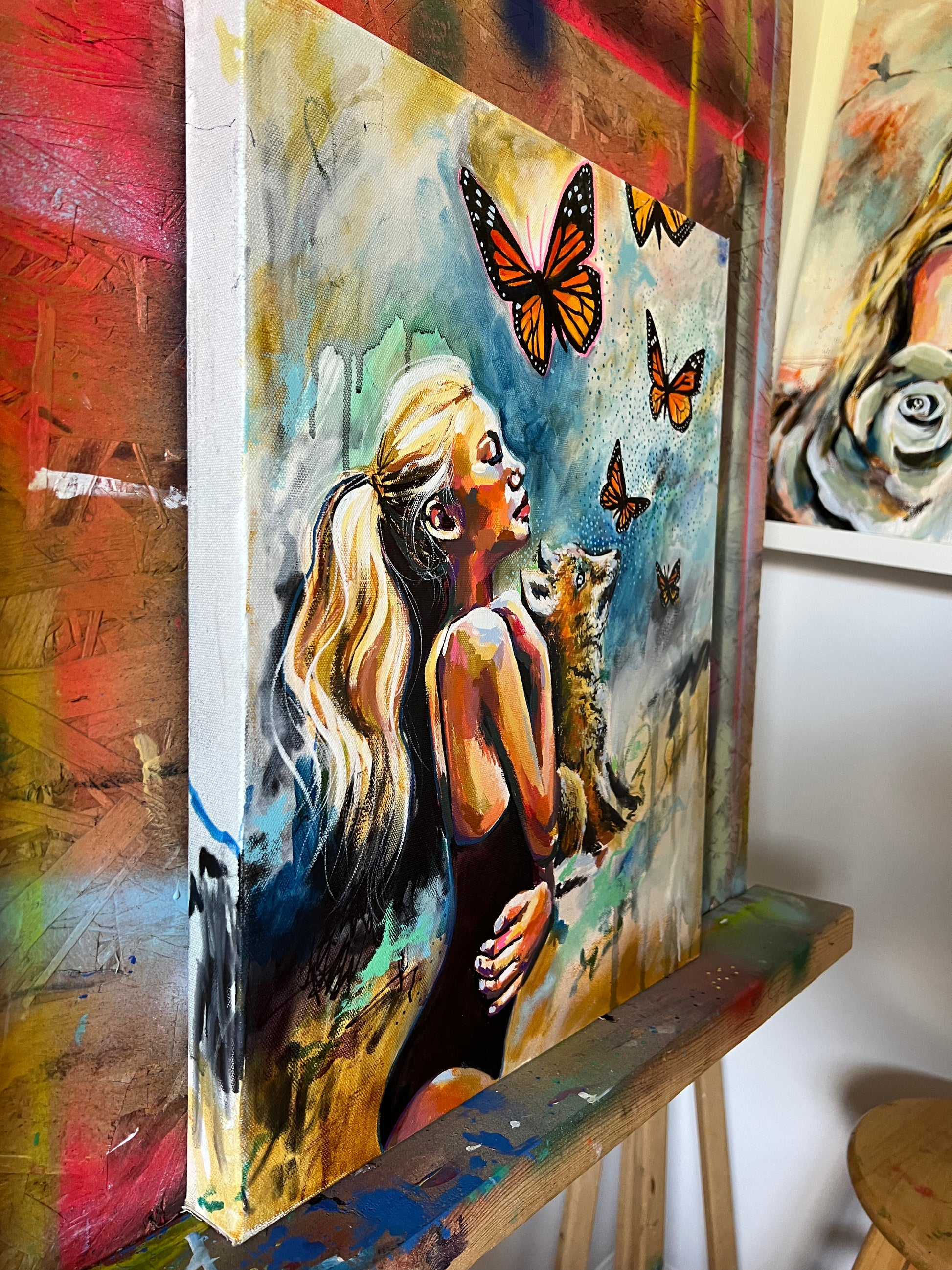 Open captures the beauty of surrendering to transformation and embracing life’s endless possibilities. Featuring a serene figure with a fox by her side and vibrant monarch butterflies in flight, this piece symbolises trust, change, and freedom. The monarchs, known for their incredible migration, represent resilience and transformation, while the fox embodies adaptability and intuition.