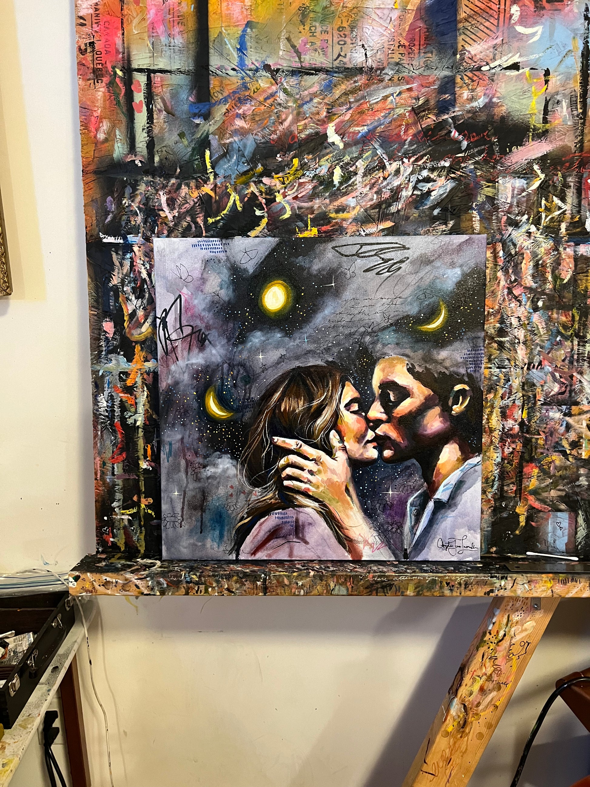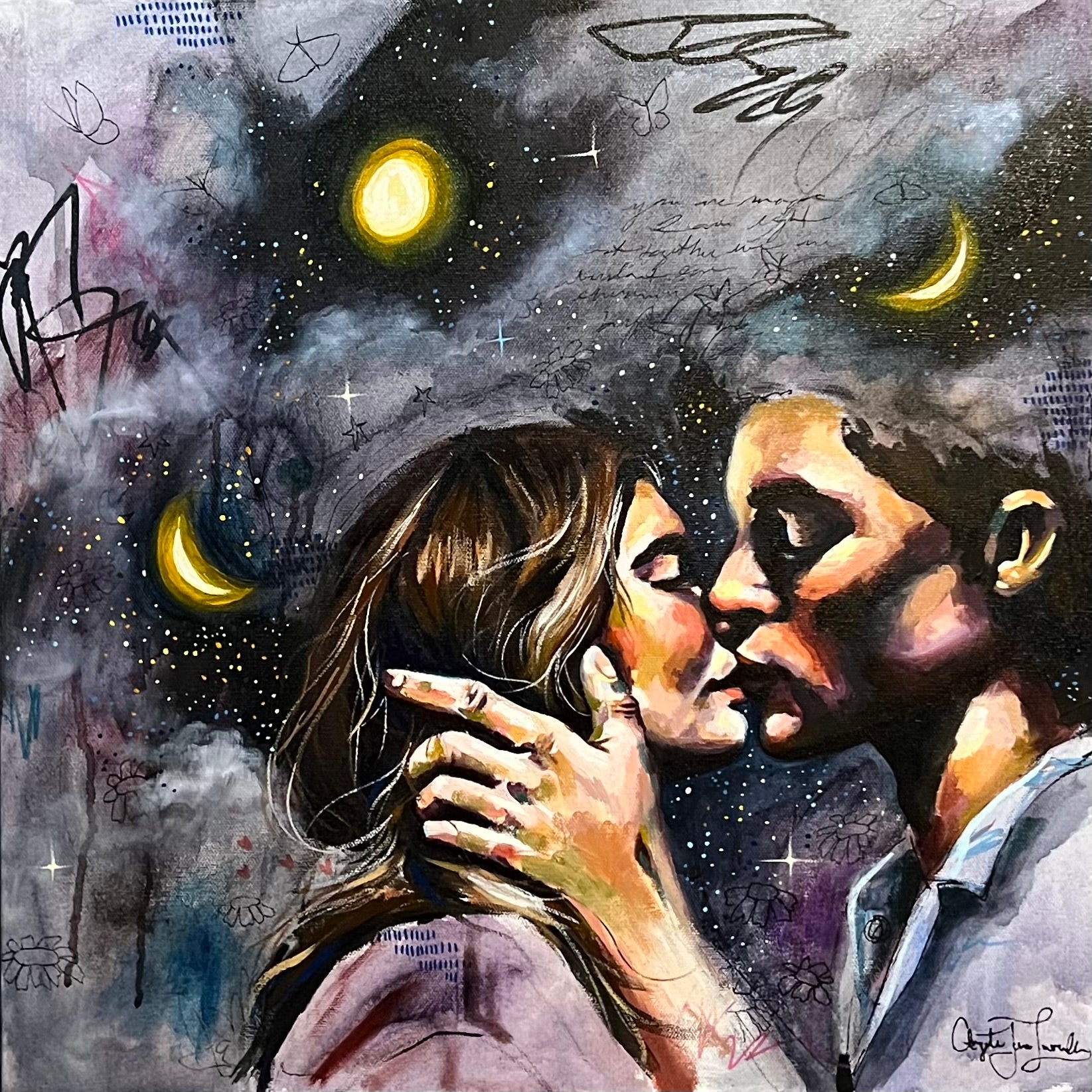 “Serendipity” captures the profound beauty of love finding its way to you when you least expect it. Under a cosmic sky adorned with glowing moons and shimmering stars, two figures share an intimate moment that feels both tender and destined. This artwork explores the magic of chance encounters and the idea that some connections are written in the stars.