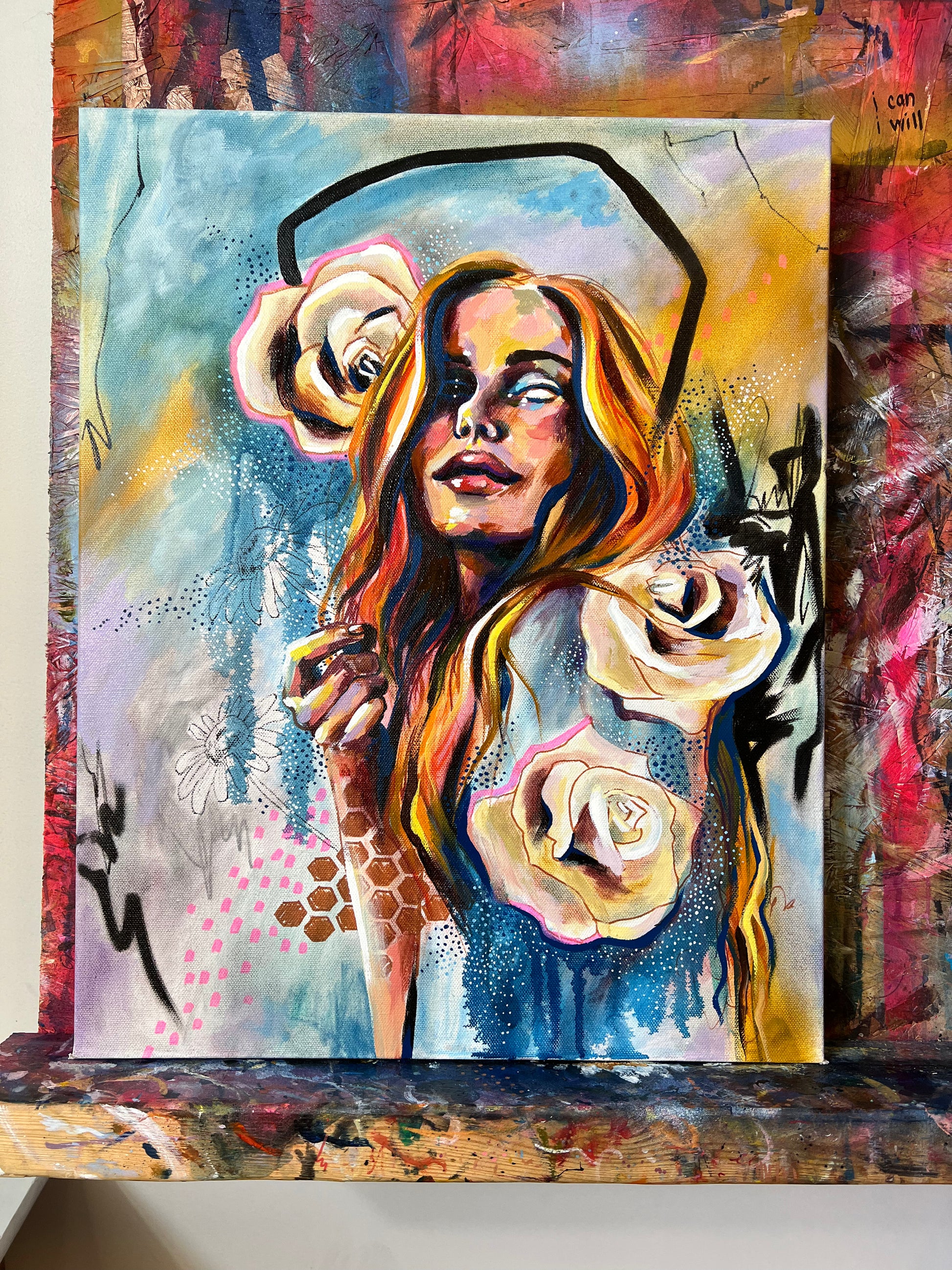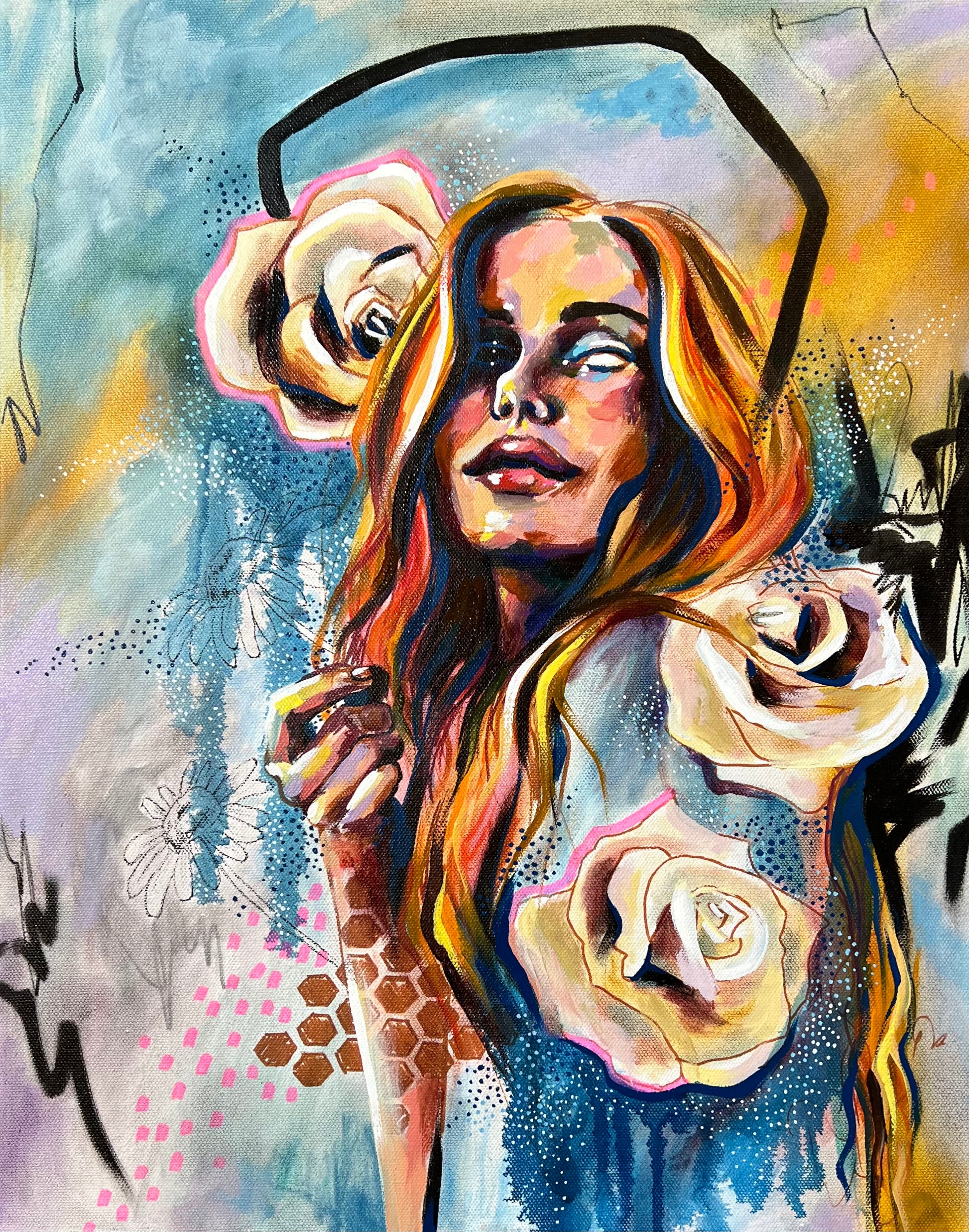 Sight Unseen explores the unseen connections that bind us to the world and each other. The woman, surrounded by ethereal roses and honeycomb textures, represents growth, fragility, and resilience. Each layer of vibrant colour, delicate lines, and bold brushstrokes mirrors the beauty and complexity of finding clarity within the chaos. This piece reminds us to trust the journey, even when the destination feels unclear