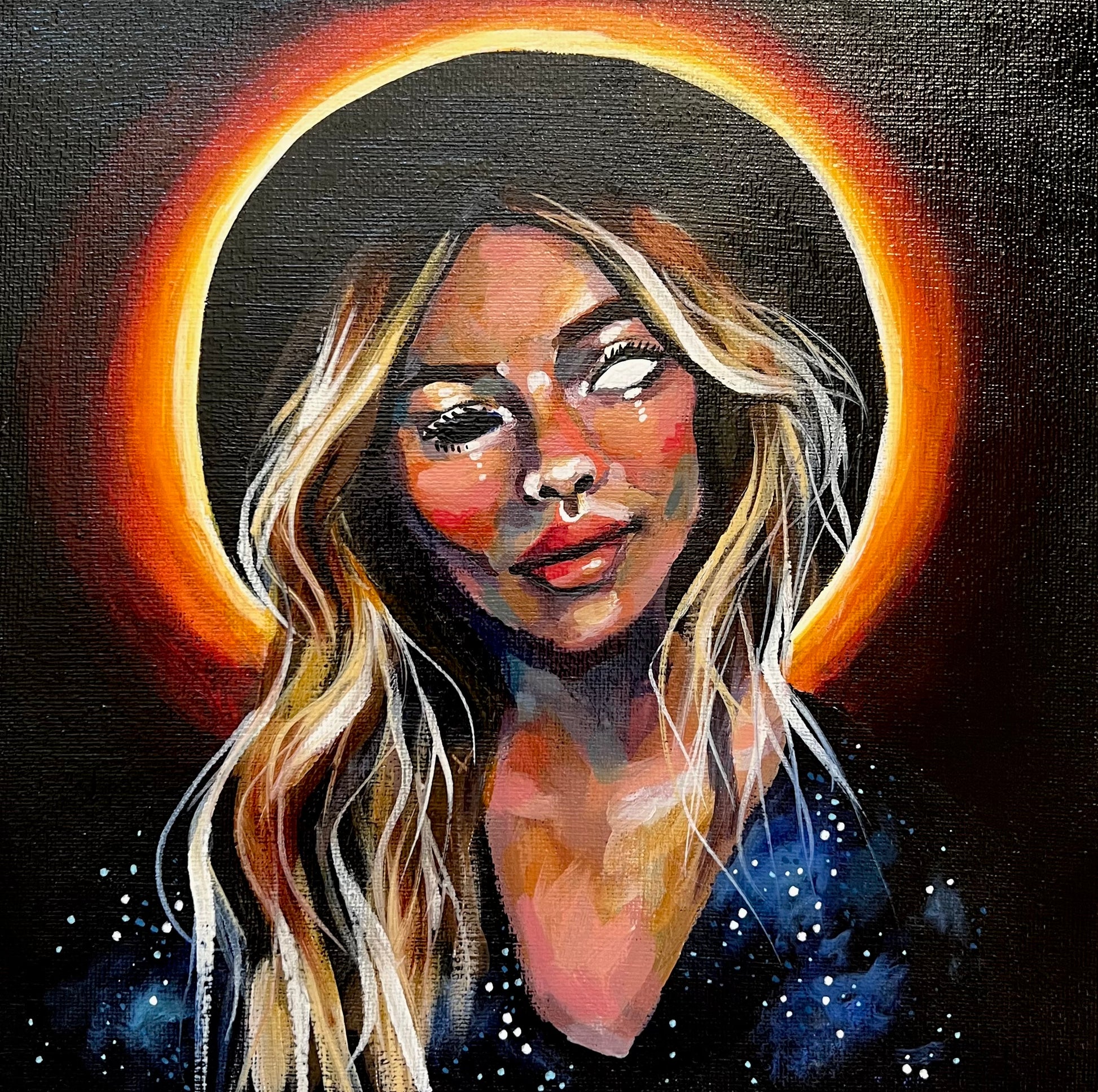 A mesmerizing exploration of divine feminine energy, “Siren Song” captures the magnetic allure of the siren’s call and the profound power of intuition. The subject’s piercing gaze, framed by a radiant halo, symbolizes enlightenment, inner strength, and a connection to celestial realms. The dark, cosmic backdrop contrasts with the glowing warmth of the figure, highlighting the delicate balance between light and shadow, beauty and mystery.